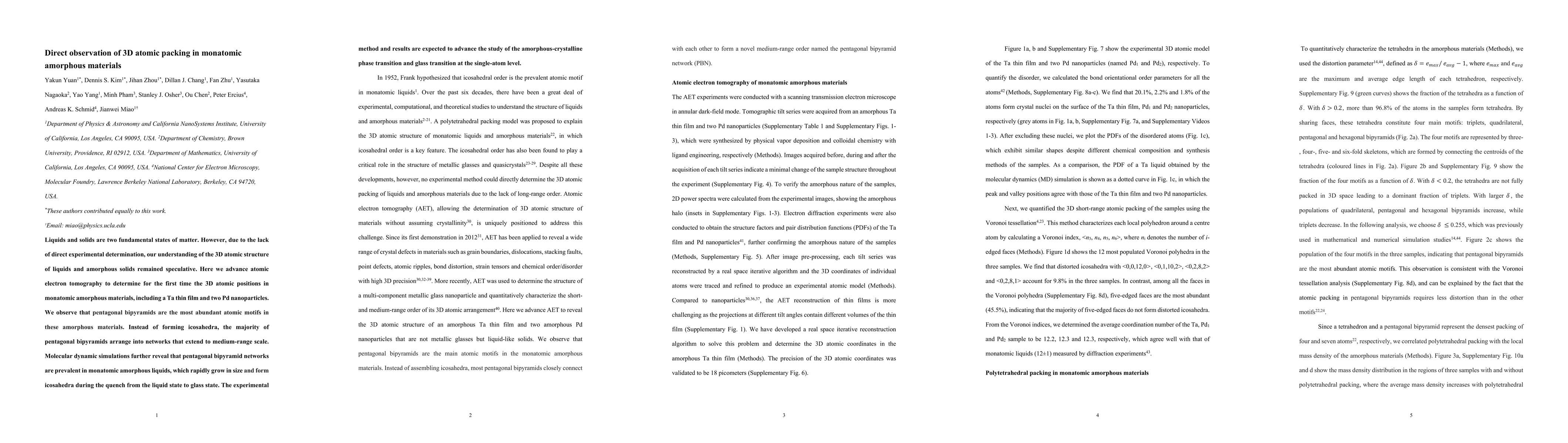 This research uses advanced atomic electron tomography to directly observe the 3D atomic structure of monatomic amorphous materials like Ta film and Pd nanoparticles for the first time. It finds that pentagonal bipyramids, rather than icosahedra, are the dominant atomic motifs, forming networks extending to medium-range scales. Molecular dynamics simulations confirm these networks' prevalence in amorphous liquids transitioning to glass, advancing the understanding of phase transitions at the single-atom level.
