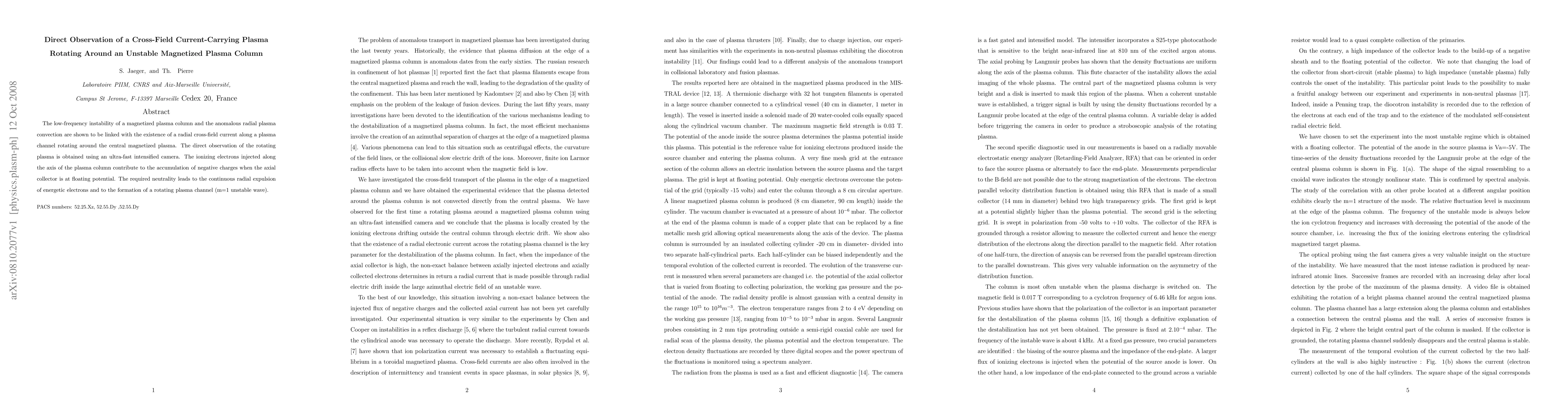 The low-frequency instability of a magnetized plasma column and the anomalous radial plasma convection are shown to be linked with the existence of a radial cross-field current along a plasma channel rotating around the central magnetized plasma. The direct observation of the rotating plasma is obtained using an ultra-fast intensified camera. The ionizing electrons injected along the axis of the plasma column contribute to the accumulation of negative charges when the axial collector is at floating potential. The required neutrality leads to the continuous radial expulsion of energetic electrons and to the formation of a rotating plasma channel (m=1 unstable wave). This situation has previously been interpreted erroneously as a diamagnetic drift wave.