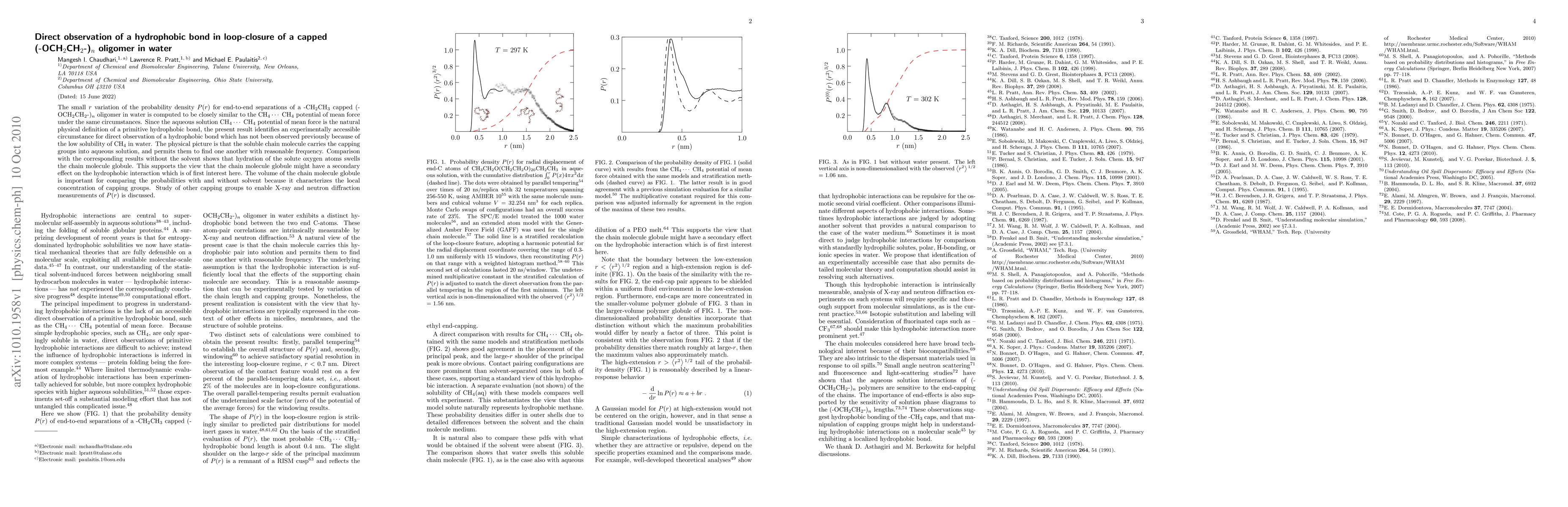 The small r variation of the probability density P(r) for end-to-end separations of a -CH2CH3 capped (-OCH2CH2-)n oligomer in water is computed to be closely similar to the CH4 ... CH4 potential of mean force under the same circumstances. Since the aqueous solution CH4 ... CH4 potential of mean force is the natural physical definition of a primitive hydrophobic bond, the present result identifies an experimentally accessible circumstance for direct observation of a hydrophobic bond which has not been observed previously because of the low solubility of CH4 in water. The physical picture is that the soluble chain molecule carries the capping groups into aqueous solution, and permits them to find one another with reasonable frequency. Comparison with the corresponding results without the solvent shows that hydration of the solute oxygen atoms swells the chain molecule globule. This supports the view that the chain molecule globule might have a secondary effect on the hydrophobic interaction which is of first interest here. The volume of the chain molecule globule is important for comparing the probabilities with and without solvent because it characterizes the local concentration of capping groups. Study of other capping groups to enable X-ray and neutron diffraction measurements of P(r) is discussed.