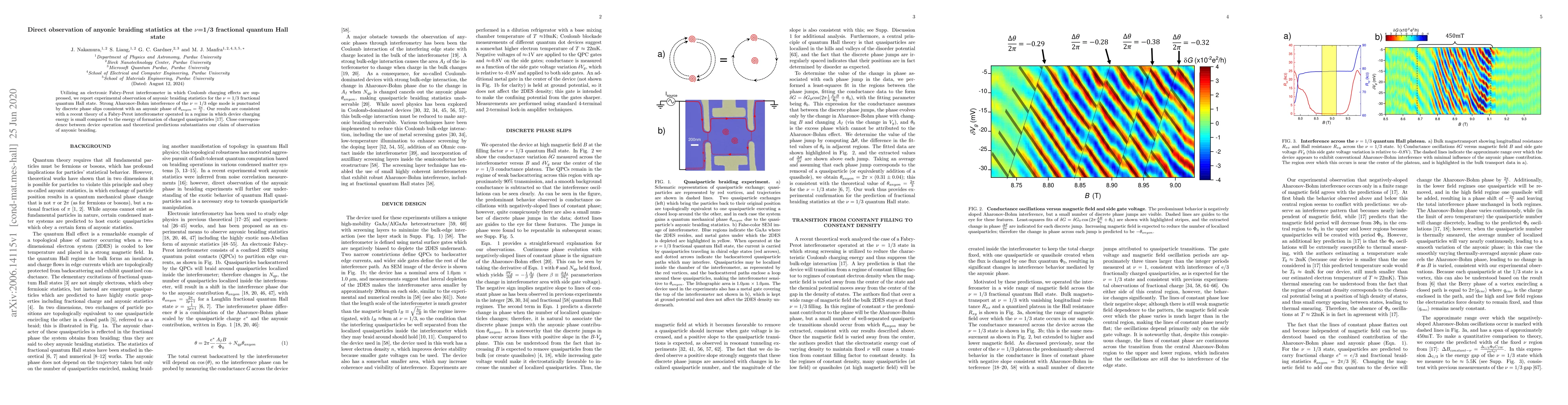 Summary: Researchers utilized a specialized electronic Fabry-Perot interferometer to observe anyonic braiding statistics in the $\nu=1/3$ fractional quantum Hall state, demonstrating an anyonic phase of $\theta_{anyon}=\frac{2\pi}{3}$ through strong Aharonov-Bohm interference and discrete phase slips, supporting theoretical predictions of quasiparticle interactions in low-charging regimes.