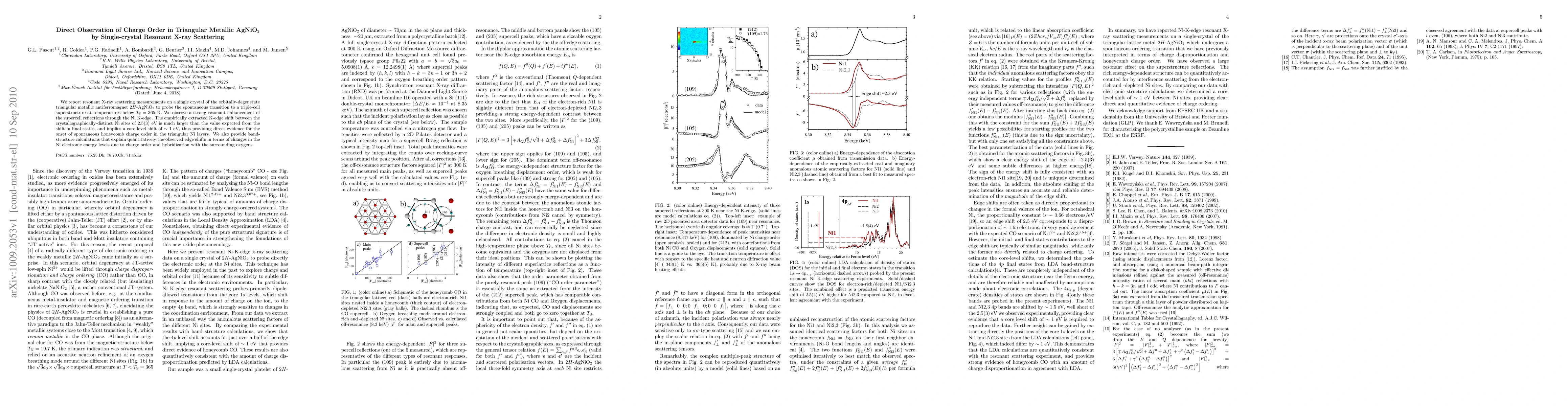 This study uses resonant X-ray scattering to observe a triple-cell superstructure in 2H-AgNiO2 below 365 K, revealing a strong enhancement at the Ni K-edge. The significant K-edge shift indicates a core-level shift of ~1 eV, providing direct evidence for spontaneous honeycomb charge order in the triangular Ni layers, corroborated by band-structure calculations.