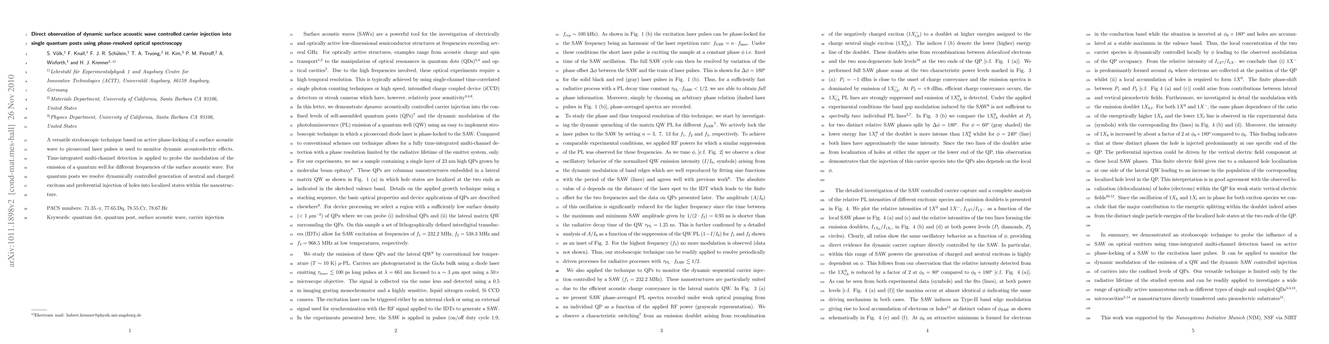 This paper employs a stroboscopic technique to observe dynamic surface acoustic wave-induced carrier injection into single quantum posts, revealing controlled generation of neutral and charged excitons and preferential hole injection via phase-resolved optical spectroscopy.