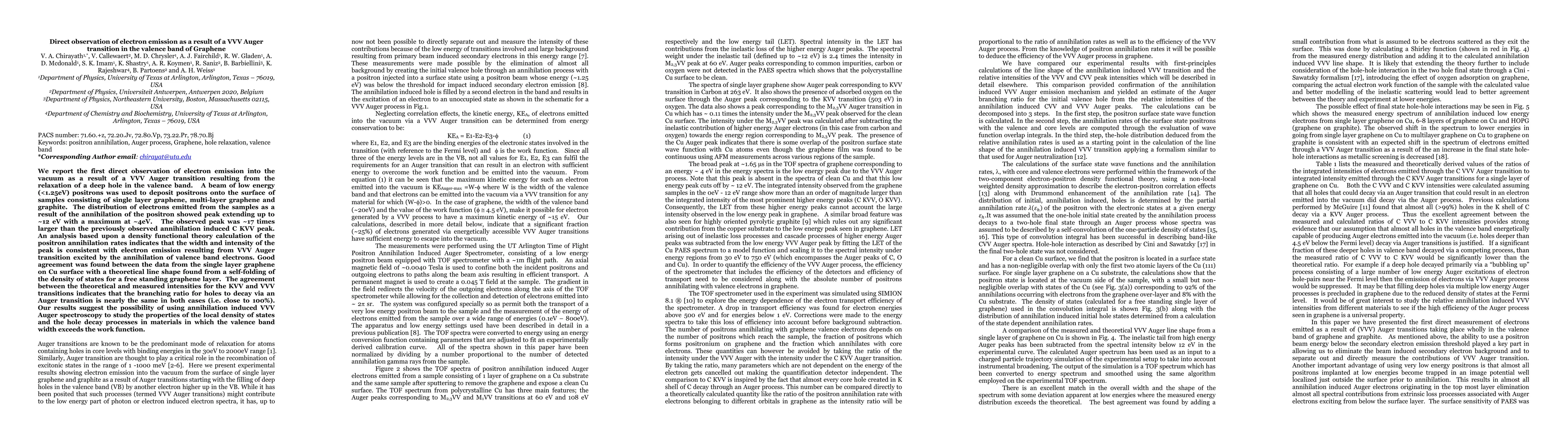 We report the first direct observation of electron emission into the vacuum as a result of a VVV Auger transition resulting from the relaxation of a deep hole in the valence band. A beam of low energy (<1.25eV) positrons was used to deposit positrons onto the surface of samples consisting of single layer graphene, multi-layer graphene and graphite. The distribution of electrons emitted from the samples as a result of the annihilation of the positron showed peak extending up to ~12 eV with a maximum at ~4eV. The observed peak was ~17 times larger than the previously observed annihilation induced C KVV peak. An analysis based upon a density functional theory calculation of the positron annihilation rates indicates that the width and intensity of the peak is consistent with electron emission resulting from VVV Auger transition excited by the annihilation of valence band electrons. Good agreement was found between the data from the single layer graphene on Cu surface with a theoretical line shape found from a self-folding of the density of states for a free standing graphene layer. The agreement between the theoretical and measured intensities for the KVV and VVV transitions indicates that the branching ratio for holes to decay via an Auger transition is nearly the same in both cases (i.e. close to 100%). Our results suggest the possibility of using annihilation induced VVV Auger spectroscopy to study the properties of the local density of states and the hole decay processes in materials in which the valence band width exceeds the work function.