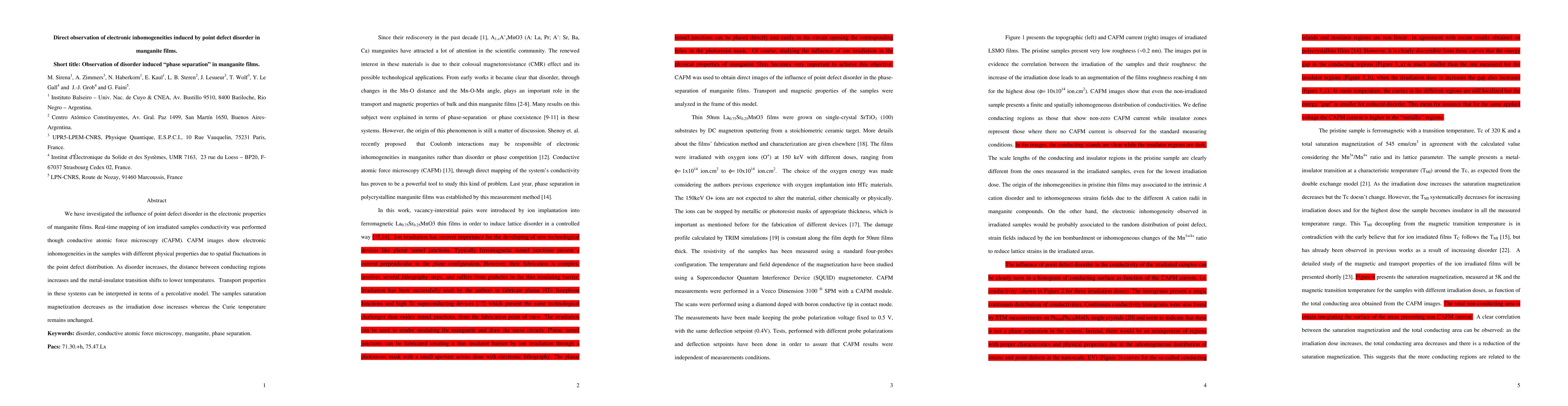 We have investigated the influence of point defect disorder in the electronic properties of manganite films. Real-time mapping of ion irradiated samples conductivity was performed though conductive atomic force microscopy (CAFM). CAFM images show electronic inhomogeneities in the samples with different physical properties due to spatial fluctuations in the point defect distribution. As disorder increases, the distance between conducting regions increases and the metal-insulator transition shifts to lower temperatures. Transport properties in these systems can be interpreted in terms of a percolative model. The samples saturation magnetization decreases as the irradiation dose increases whereas the Curie temperature remains unchanged.