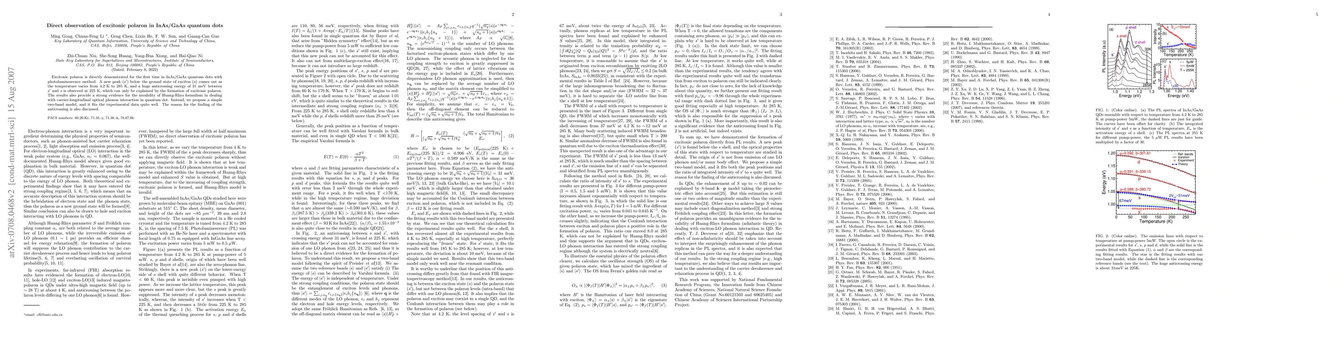 This paper directly observes an excitonic polaron in InAs/GaAs quantum dots using photoluminescence, revealing a new peak ($s'$) and a significant anticrossing energy of 31 meV at 225 K, challenging the Huang-Rhys formalism. A proposed two-band model effectively explains the observed phenomena.