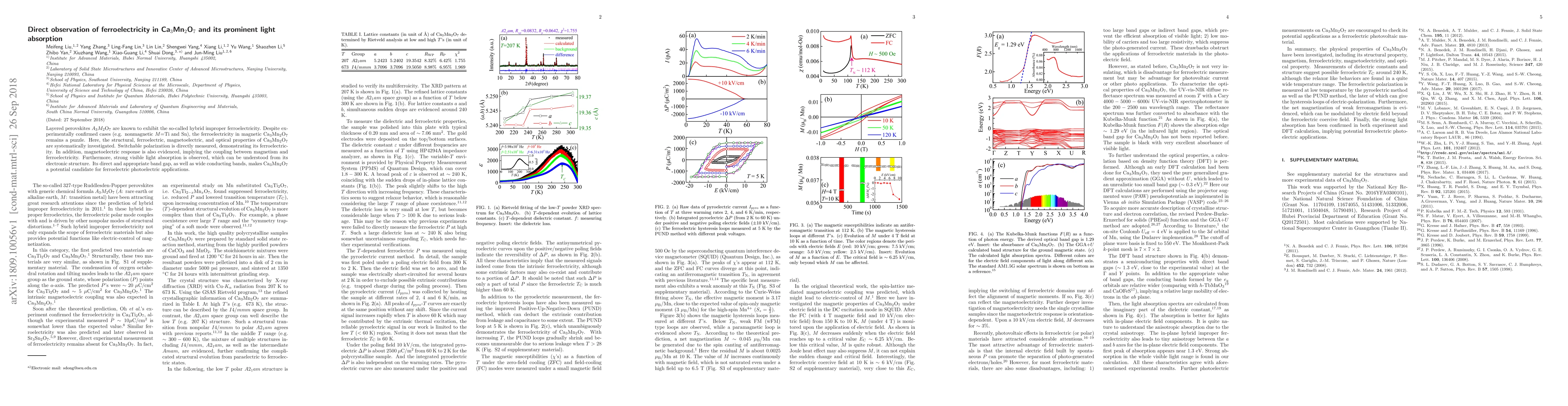 This paper directly observes ferroelectricity in Ca$_3$Mn$_2$O$_7$, confirming its hybrid improper ferroelectric nature and demonstrating a magnetoelectric response, indicating coupling between magnetism and ferroelectricity. It also highlights strong visible light absorption, suggesting potential for ferroelectric photoelectric applications.