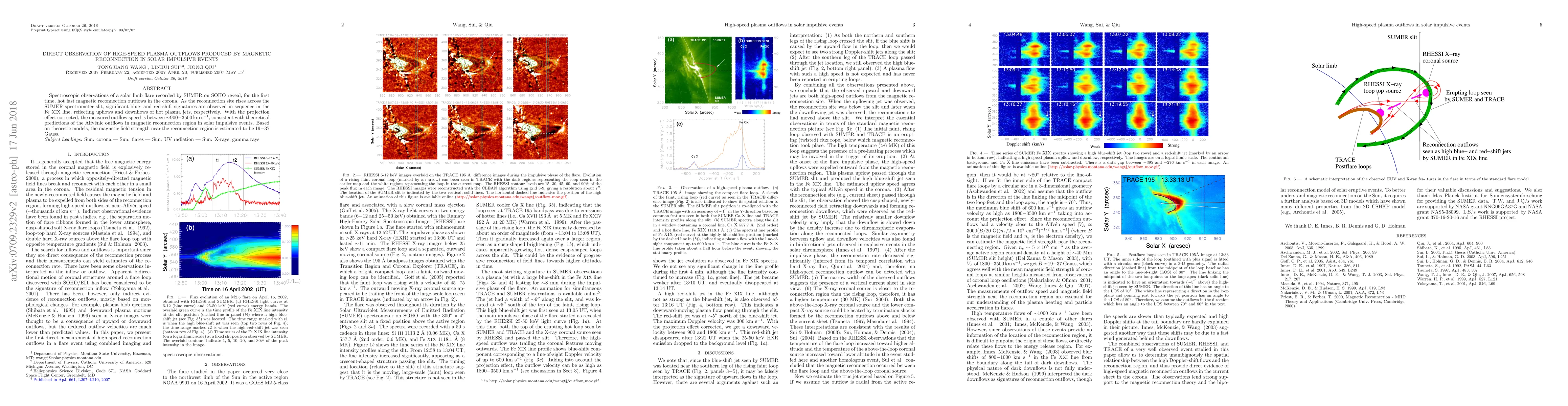 This paper reports the first direct spectroscopic observation of high-speed plasma outflows in solar impulsive events, revealing Alfvenic outflow speeds between 900-3500 km/s, consistent with theoretical predictions. The study estimates the magnetic field strength near the reconnection site to be 19-37 Gauss.