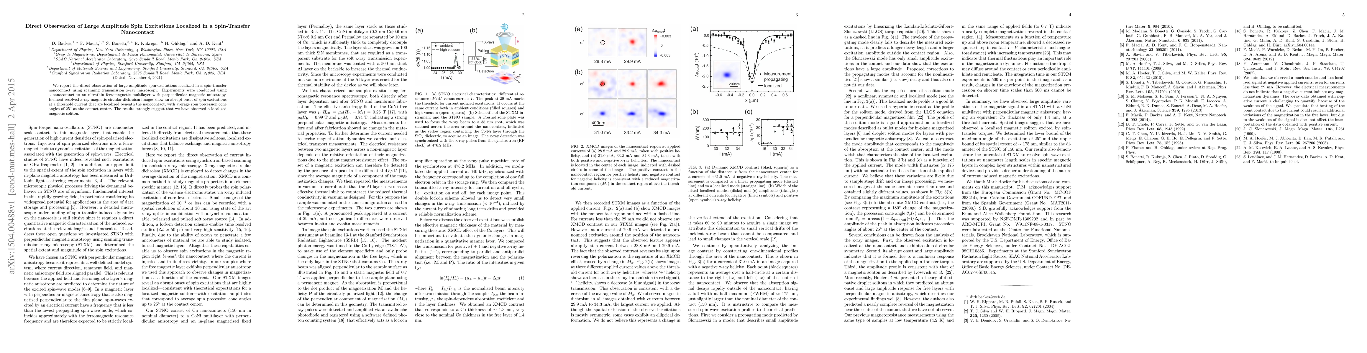 This paper reports the direct observation of large amplitude spin-excitations localized in a spin-transfer nanocontact using scanning transmission x-ray microscopy. The study reveals localized magnetic solitons beneath the nanocontact in an ultrathin ferromagnetic multilayer, evidenced by element-resolved x-ray magnetic circular dichroism images.