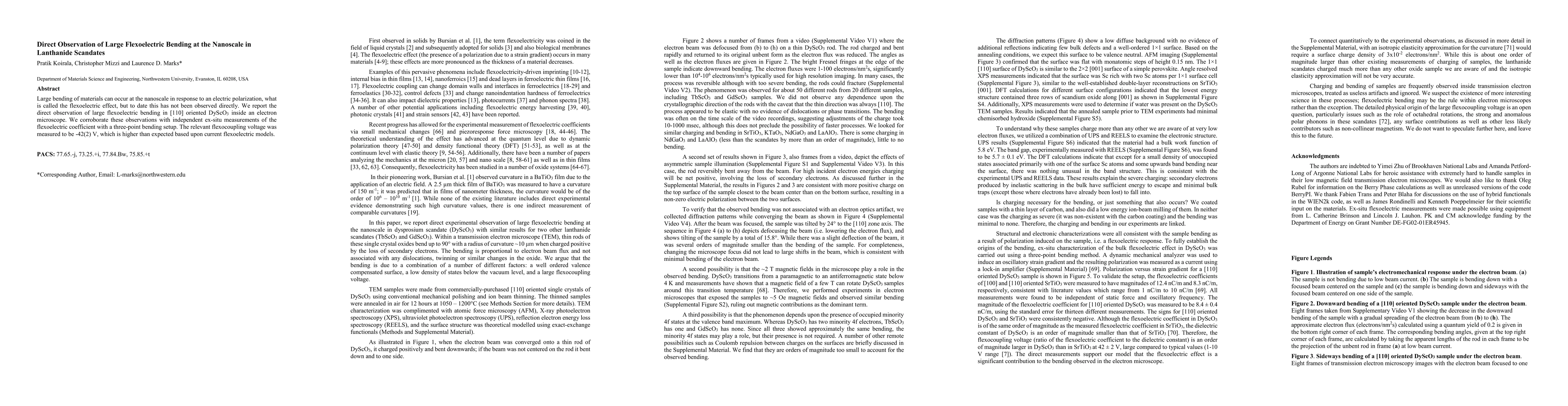 This research paper reports the first direct observation of large flexoelectric bending at the nanoscale in DyScO3 using an electron microscope, demonstrating significant material deformation in response to electric polarization. Complementary ex-situ measurements confirm these findings, revealing an unexpectedly high flexocoupling voltage of -42(2) V.