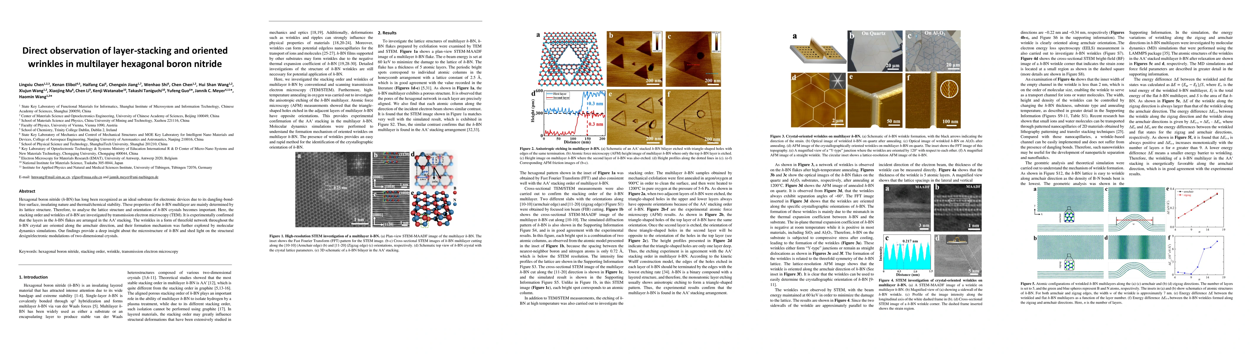 Researchers studied the layer-stacking and oriented wrinkles in hexagonal boron nitride (h-BN) using transmission electron microscopy, finding that layers stack in an AA' pattern and wrinkles form a threefold network along armchair directions.
