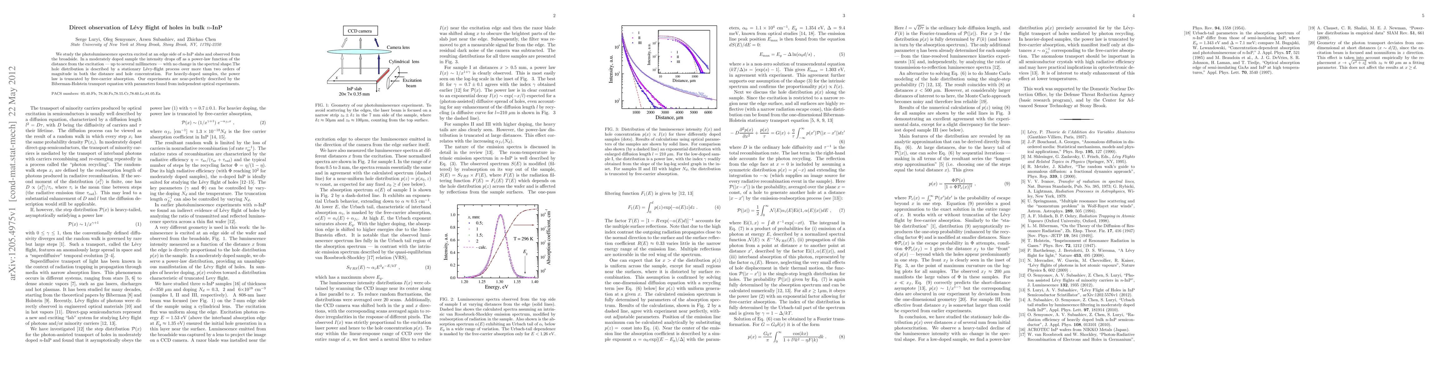 We study the photoluminescence spectra excited at an edge side of n-InP slabs and observed from the broadside. In a moderately doped sample the intensity drops off as a power-law function of the distance from the excitation - up to several millimeters - with no change in the spectral shape.The hole distribution is described by a stationary Levy-flight process over more than two orders of magnitude in both the distance and hole concentration. For heavily-doped samples, the power law is truncated by free-carrier absorption. Our experiments are near-perfectly described by the Biberman-Holstein transport equation with parameters found from independent optical experiments.