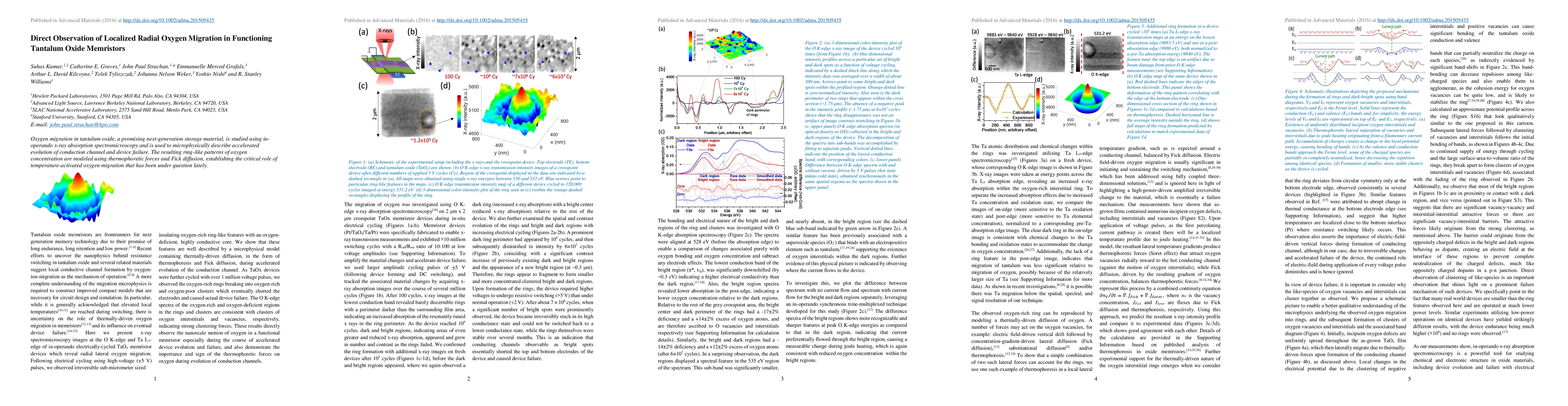 This study directly observes oxygen migration in functioning tantalum oxide memristors using in-operando x-ray absorption spectromicroscopy, revealing ring-like oxygen concentration patterns and confirming the critical role of temperature-activated migration in conduction channel evolution and device failure.