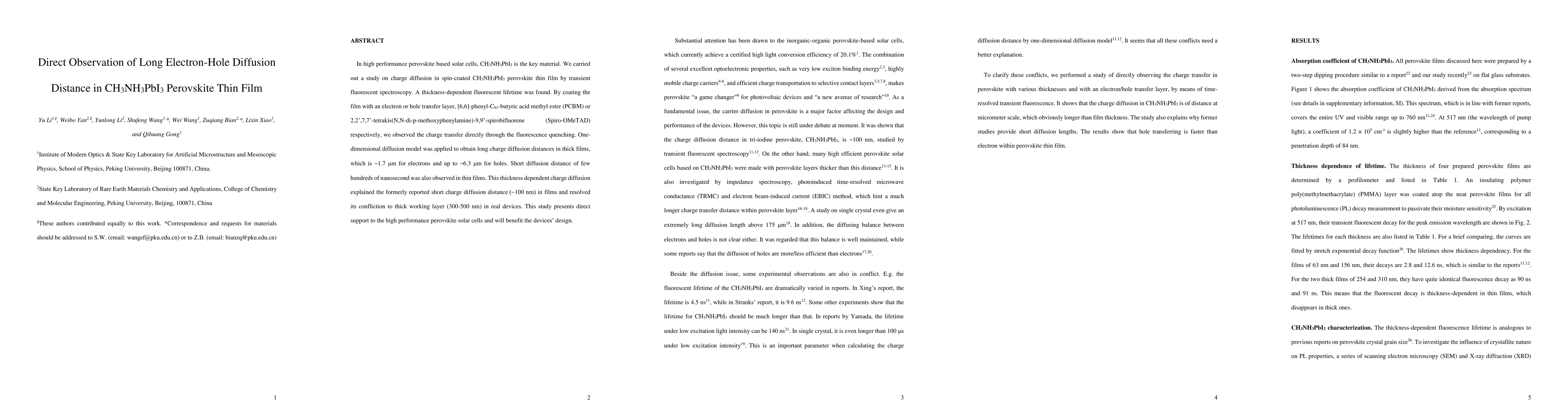 This study utilized transient fluorescent spectroscopy to observe long electron-hole diffusion distances in CH3NH3PbI3 perovskite thin film, revealing ~1.7 µm for electrons and up to ~6.3 µm for holes in thick films, which resolves previous conflicts regarding charge diffusion in real devices.