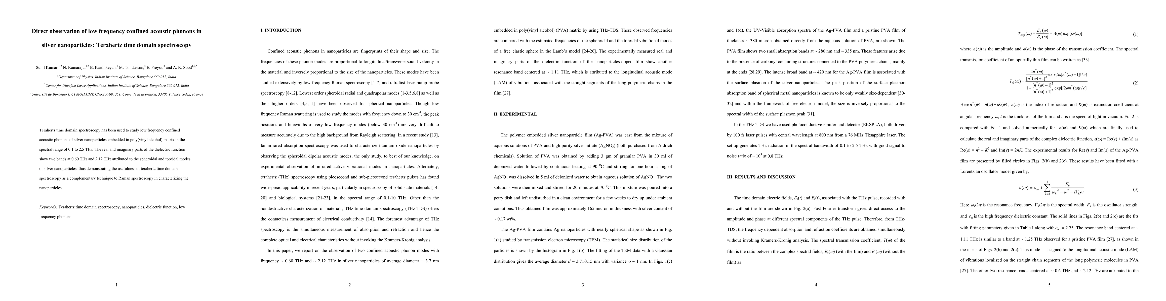 This study utilizes terahertz time domain spectroscopy to observe low frequency confined acoustic phonons in silver nanoparticles, identifying two distinct bands at 0.60 THz and 2.12 THz corresponding to spheroidal and toroidal modes, highlighting the technique's effectiveness in nanoparticle analysis.