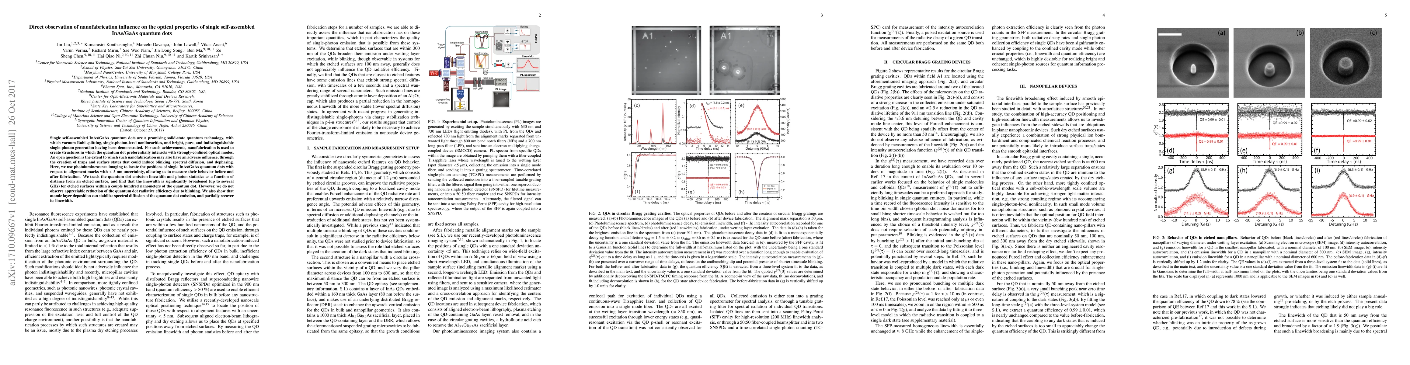 This study investigates the impact of nanofabrication on the optical properties of single InAs/GaAs quantum dots using photoluminescence imaging. The research finds that etching near quantum dots significantly broadens emission linewidths but does not notably reduce radiative efficiency, while atomic layer deposition can stabilize spectral diffusion and partially recover the linewidth.