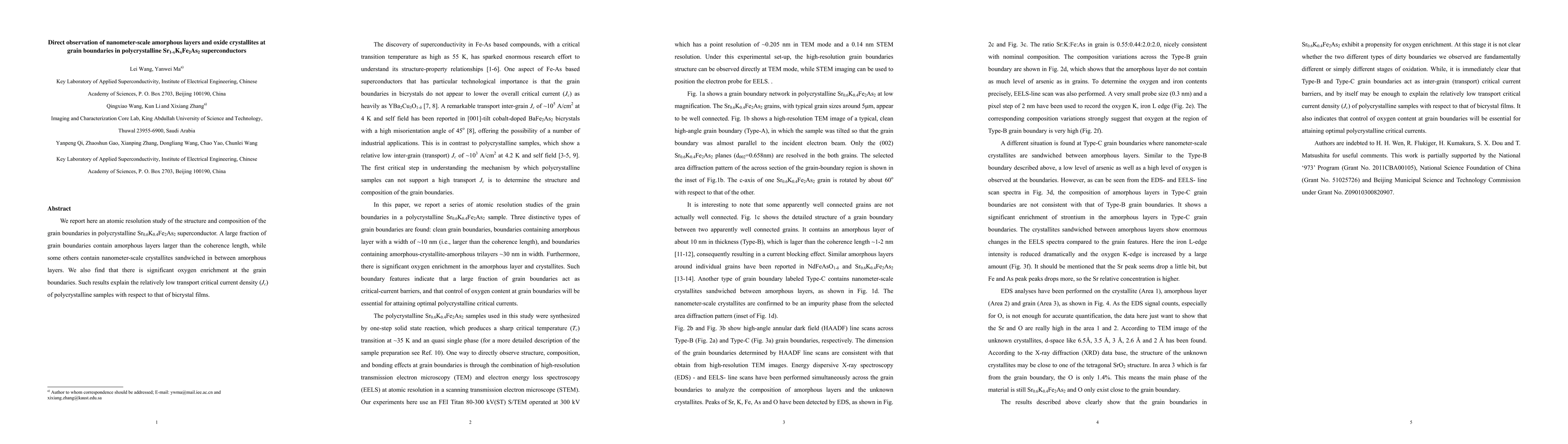 This study reveals atomic resolution details of grain boundaries in polycrystalline Sr0.6K0.4Fe2As2 superconductors, showing amorphous layers and oxide crystallites that contribute to the low transport critical current density (Jc) due to oxygen enrichment.