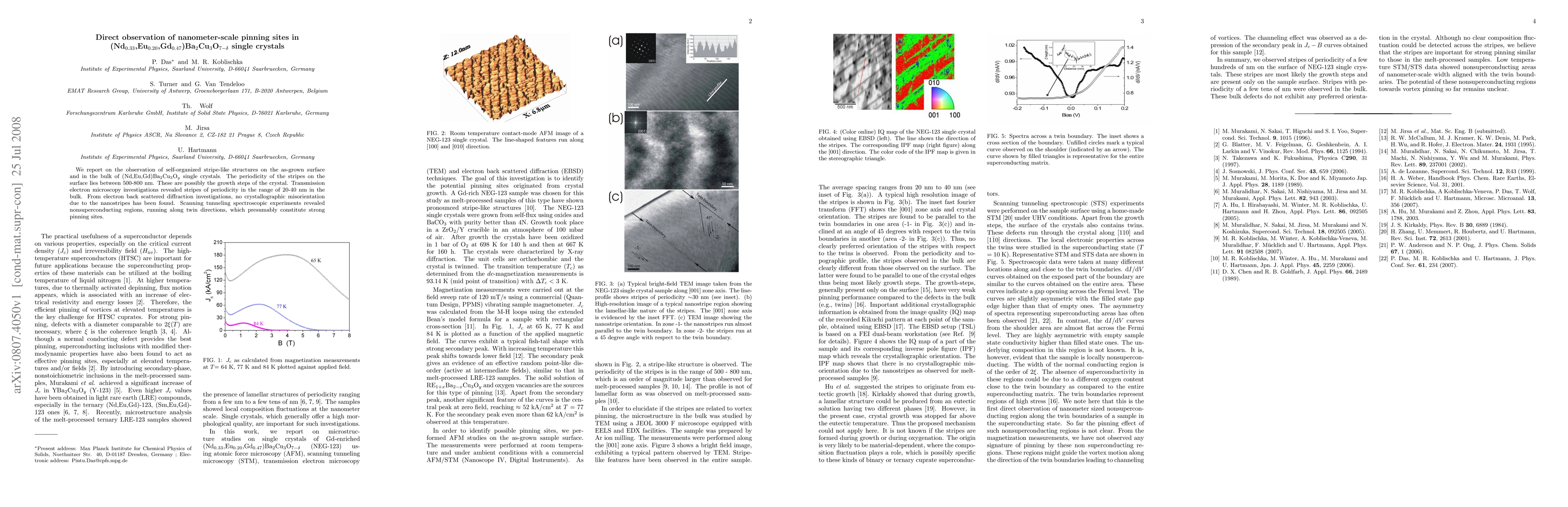 We report on the observation of self-organized stripe-like structures on the as-grown surface and in the bulk of (Nd,Eu,Gd)Ba$_2$Cu$_3$O$_y$ single crystals. The periodicity of the stripes on the surface lies between 500 and 800 nm. These are possibly the growth steps of the crystal. Transmission electron microscopy investigations revealed stripes of periodicity in the range of 20 to 40 nm in the bulk. From electron back scattered diffraction investigations, no crystallographic misorientation due to the nanostripes has been found. Scanning tunneling spectroscopic experiments revealed nonsuperconducting regions, running along twin directions, which presumably constitute strong pinning sites.