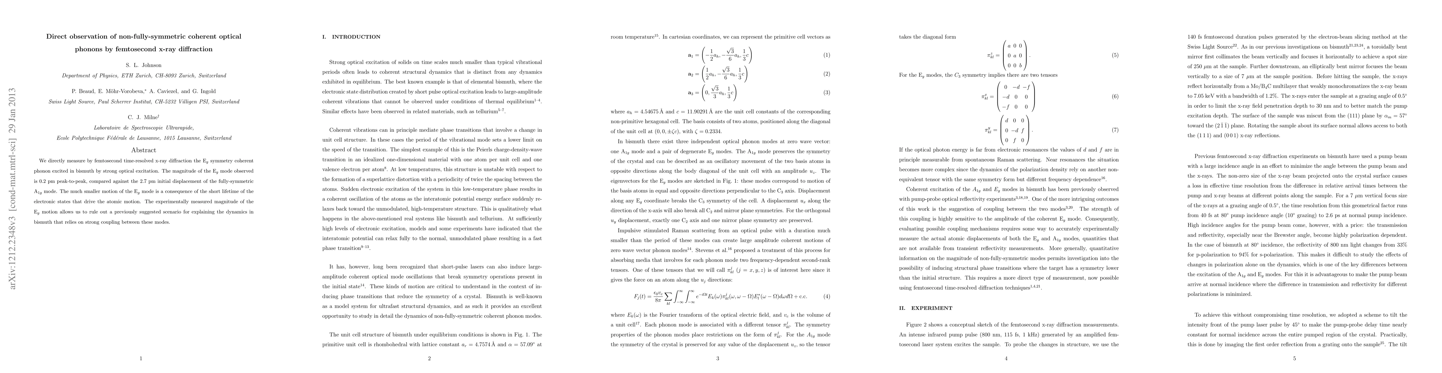 We directly measure by femtosecond time-resolved x-ray diffraction the E$_g$ symmetry coherent phonon excited in bismuth by strong optical excitation. The magnitude of the E$_g$ mode observed is 0.2 pm peak-to-peak, compared against the 2.7 pm initial displacement of the fully-symmetric A$_{1g}$ mode. The much smaller motion of the E$_g$ mode is a consequence of the short lifetime of the electronic states that drive the atomic motion. The experimentally measured magnitude of the E$_g$ motion allows us to rule out a previously suggested scenario for explaining the dynamics in bismuth that relies on strong coupling between these modes.