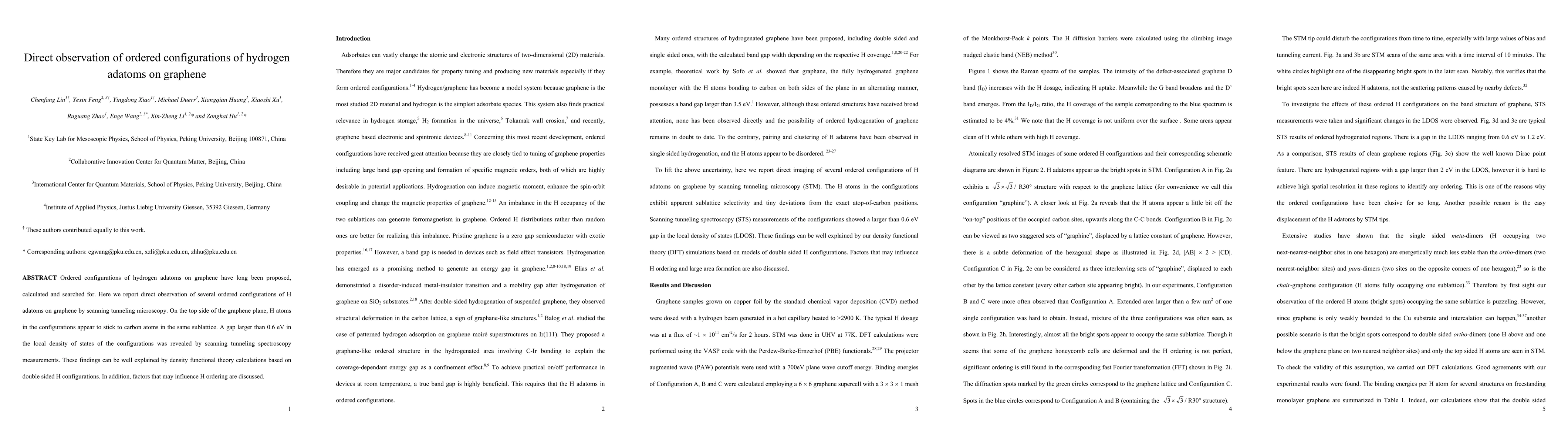This research paper reports the direct observation of ordered configurations of hydrogen adatoms on graphene using scanning tunneling microscopy, showing H atoms adhering to carbon atoms in the same sublattice. Scanning tunneling spectroscopy reveals a gap larger than 0.6 eV in local density of states, corroborated by density functional theory calculations.