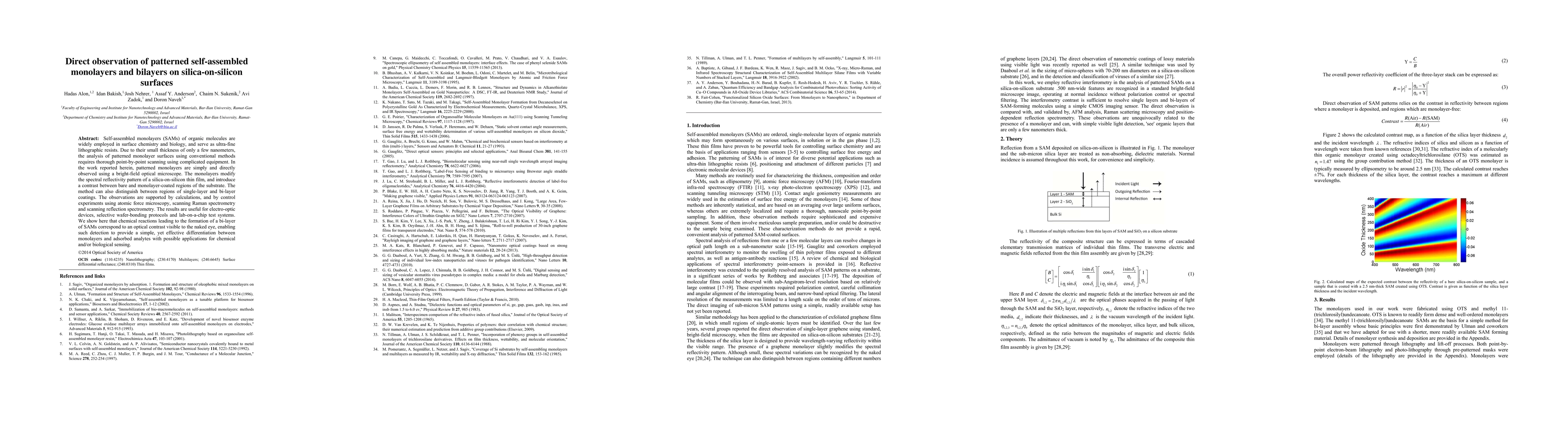 This paper presents a method for directly observing patterned self-assembled monolayers (SAMs) on silica-on-silicon surfaces using a bright-field optical microscope, revealing spectral reflectivity differences. The technique can distinguish between monolayer and bilayer coatings, with applications in electro-optic devices and chemical/biological sensing.