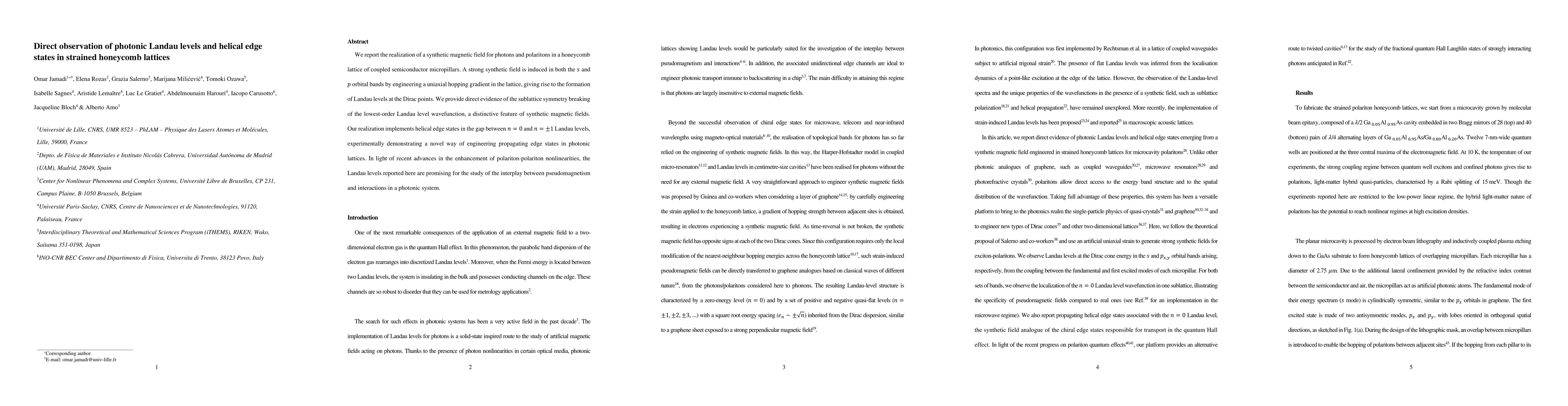 Researchers have created synthetic magnetic fields for photons in a honeycomb lattice of semiconductor micropillars, observing photonic Landau levels and helical edge states. This achievement provides direct evidence of the lowest-order Landau level's sublattice symmetry breaking and demonstrates novel propagating edge states in photonic systems.