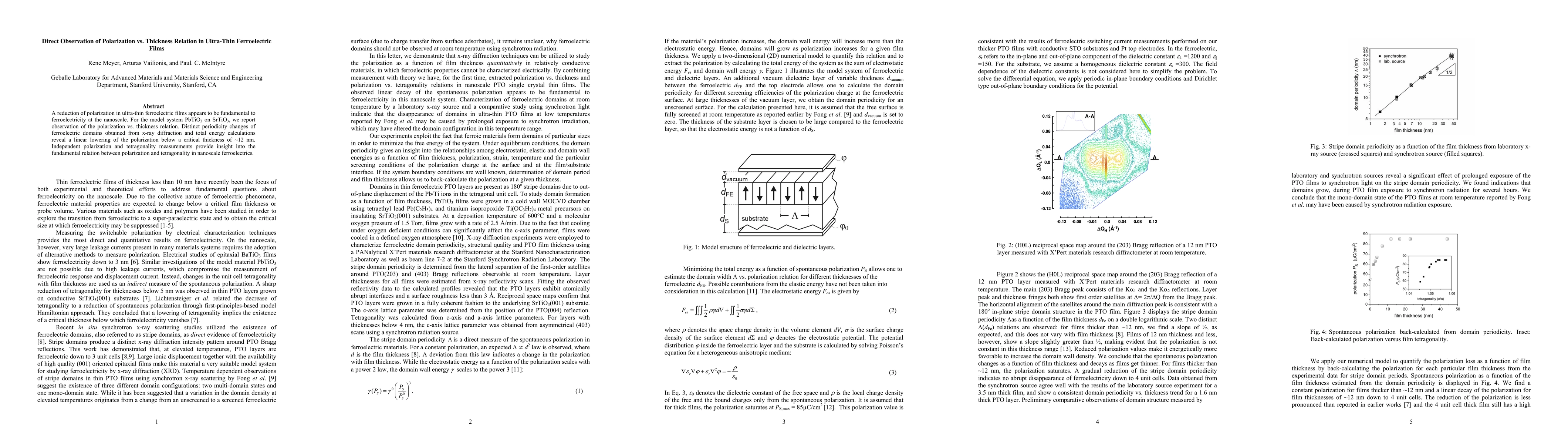 This study observes the polarization vs. thickness relationship in ultra-thin PbTiO3 ferroelectric films on SrTiO3 substrates, revealing a linear decrease in polarization below a critical thickness of ~12 nm. The findings provide insight into the fundamental link between polarization and tetragonality in nanoscale ferroelectrics.