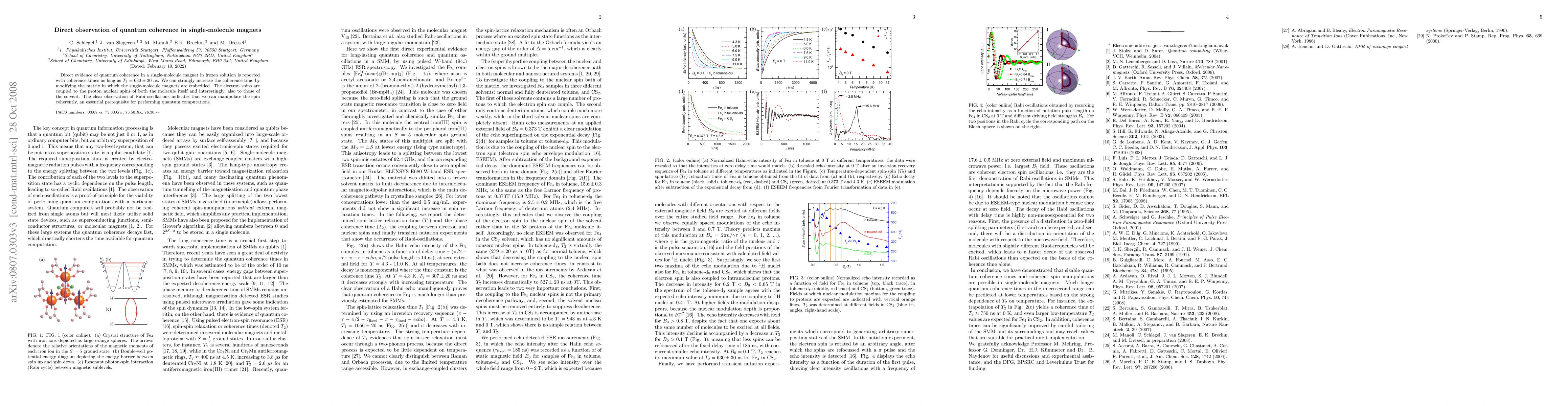 Summary: The study presents direct evidence of quantum coherence in single-molecule magnets in frozen solution, achieving coherence times up to 630 ns. Enhancing the embedding matrix increases coherence, and manipulation via Rabi oscillations indicates potential for quantum computations.