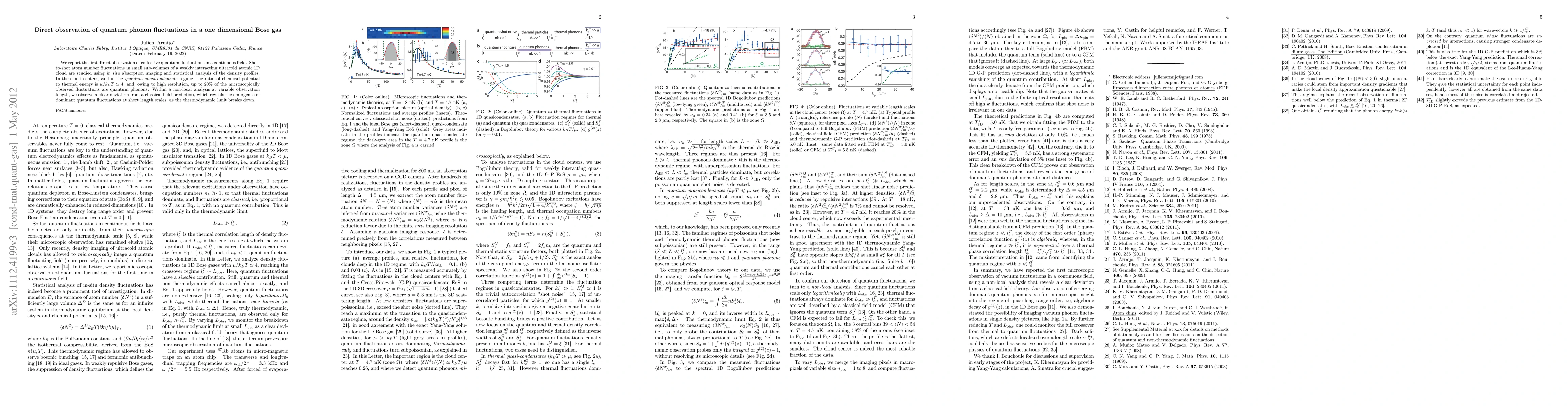 We report the first direct observation of collective quantum fluctuations in a continuous field. Shot-to-shot atom number fluctuations in small sub-volumes of a weakly interacting ultracold atomic 1D cloud are studied using \textit{in situ} absorption imaging and statistical analysis of the density profiles. In the cloud centers, well in the \textit{quantum quasicondensate} regime, the ratio of chemical potential to thermal energy is $\mu/ k_B T\simeq4$, and, owing to high resolution, up to 20% of the microscopically observed fluctuations are quantum phonons. Within a non-local analysis at variable observation length, we observe a clear deviation from a classical field prediction, which reveals the emergence of dominant quantum fluctuations at short length scales, as the thermodynamic limit breaks down.