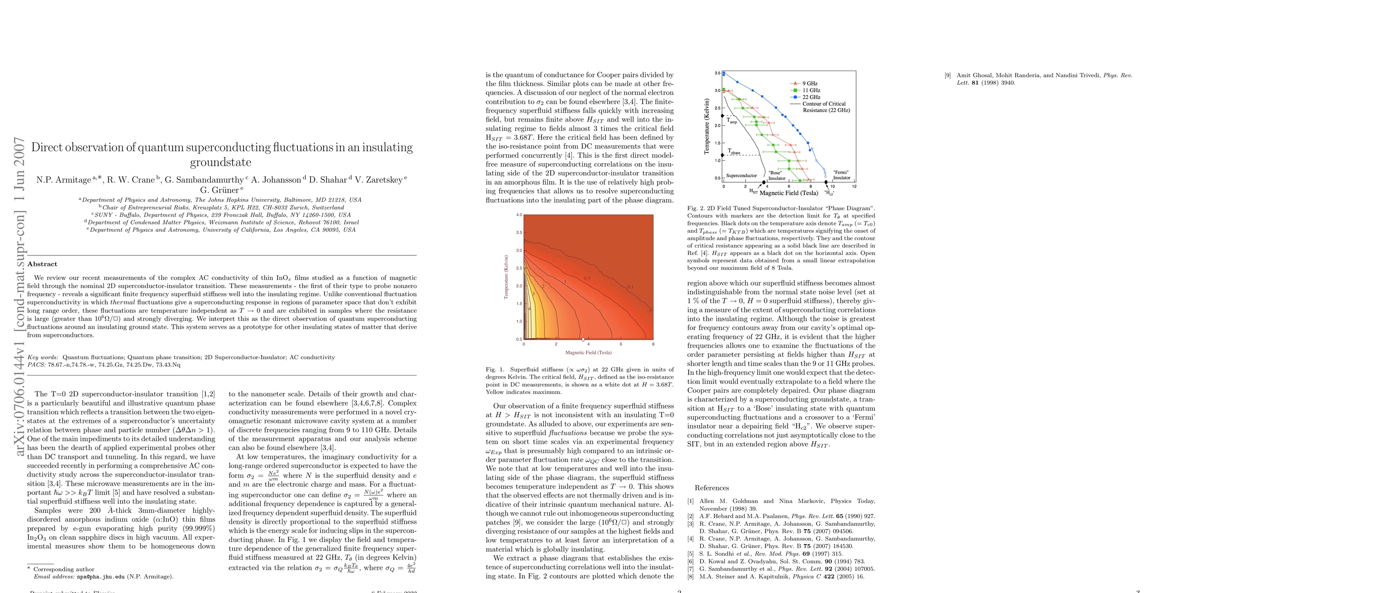 We review our recent measurements of the complex AC conductivity of thin InO_x films studied as a function of magnetic field through the nominal 2D superconductor-insulator transition. These measurements - the first of their type to probe nonzero frequency - reveals a significant finite frequency superfluid stiffness well into the insulating regime. Unlike conventional fluctuation superconductivity in which thermal fluctuations give a superconducting response in regions of parameter space that don't exhibit long range order, these fluctuations are temperature independent as T --> 0 and are exhibited in samples where the resistance is large (greater than 10^6 Ohms/Square) and strongly diverging. We interpret this as the direct observation of quantum superconducting fluctuations around an insulating ground state. This system serves as a prototype for other insulating states of matter that derive from superconductors.