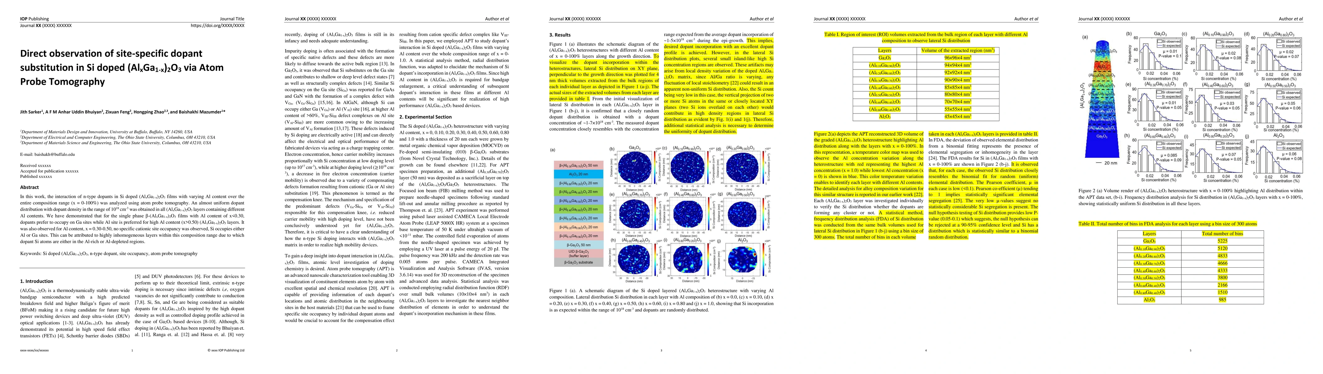 This paper uses atom probe tomography to observe dopant substitution in Si-doped (AlxGa1-x)2O3 films, finding uniform dopant distribution across varying Al contents. Dopants prefer Ga sites for low Al content and Al sites for high Al content, with no specific site preference for intermediate Al contents due to compositional inhomogeneity.