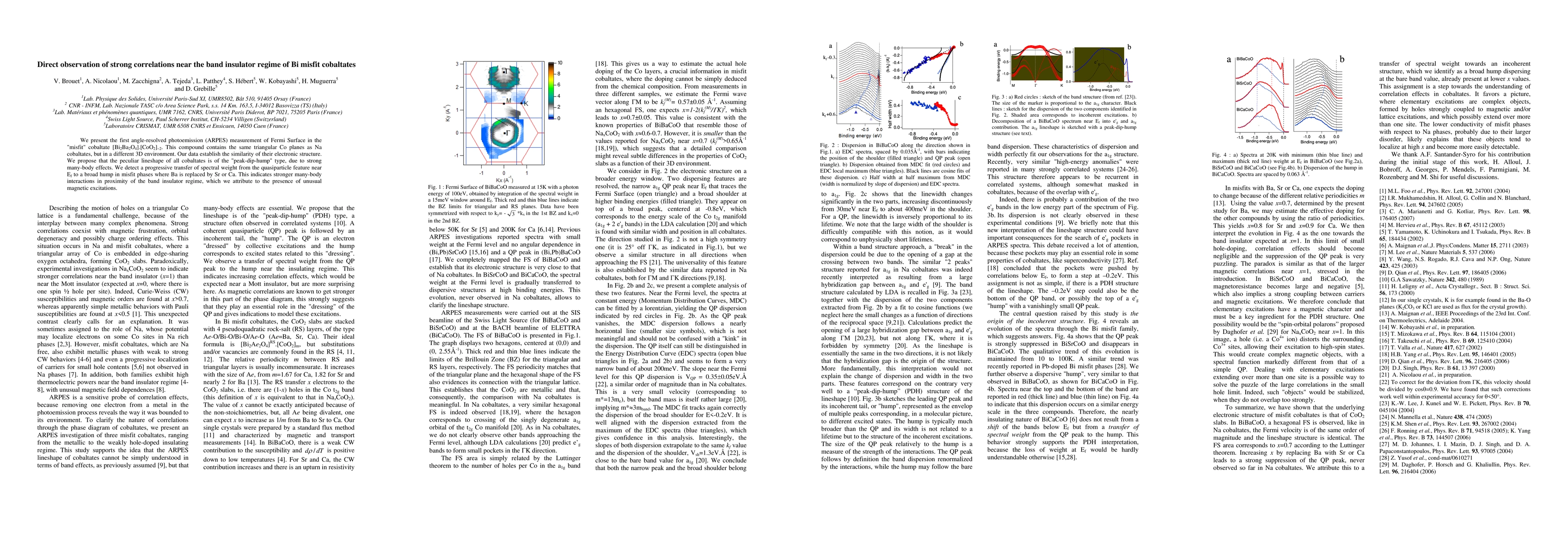 We present the first angle-resolved photoemission (ARPES) measurement of Fermi Surface in the "misfit" cobaltate [Bi2Ba2O4].[CoO2]~2. This compound contains the same triangular Co planes as Na cobaltates, but in a different 3D environment. Our data establish the similarity of their electronic structure. We propose that the peculiar lineshape of all cobaltates is of the "peak-dip-hump" type, due to strong many-body effects. We detect a progressive transfer of spectral weight from the quasiparticle feature near Ef to a broad hump in misfit phases where Ba is replaced by Sr or Ca. This indicates stronger many-body interactions in proximity of the band insulator regime, which we attribute to the presence of unusual magnetic excitations.