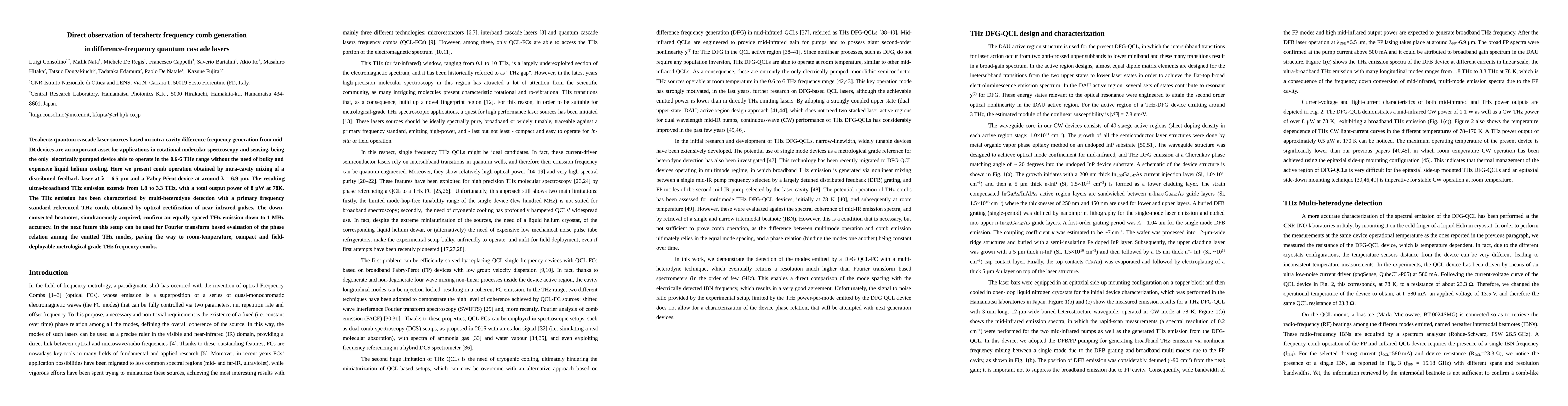 This paper reports the generation of a terahertz frequency comb via intra-cavity difference-frequency mixing in quantum cascade lasers, achieving broadband emission from 1.8 to 3.3 THz with 8 μW output power at 78K. The comb's equally spaced emission is confirmed by multi-heterodyne detection, suggesting potential for compact, metrological-grade THz frequency combs at room temperature.