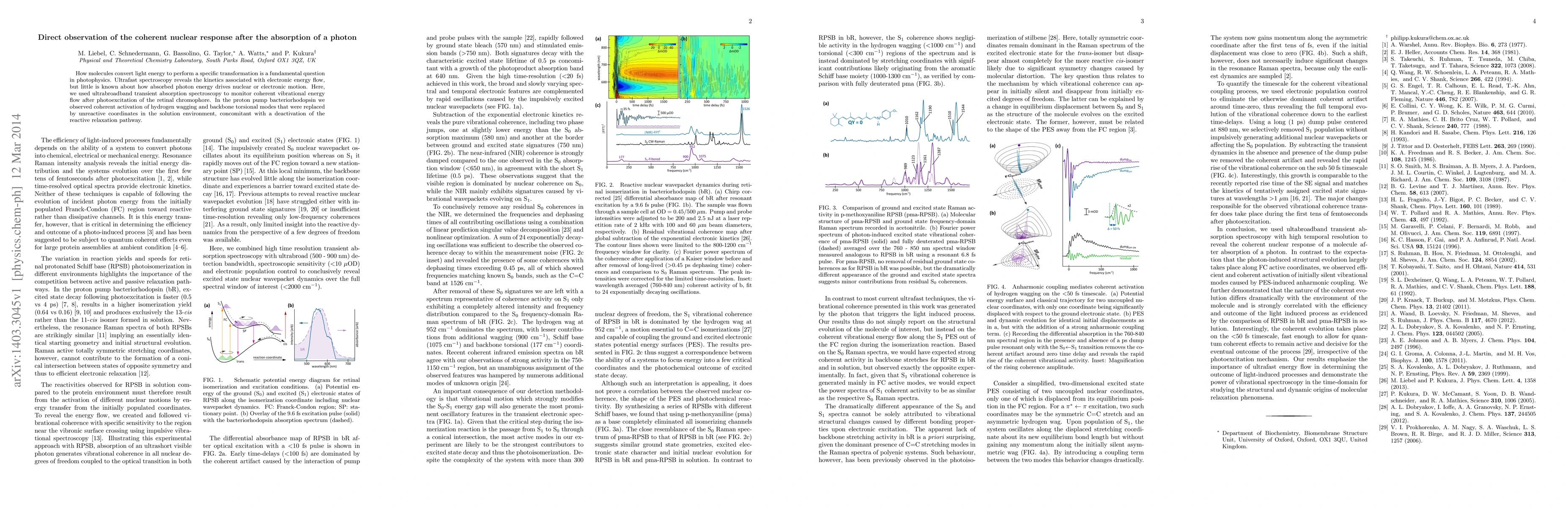 How molecules convert light energy to perform a specific transformation is a fundamental question in photophysics. Ultrafast spectroscopy reveals the kinetics associated with electronic energy flow, but little is known about how absorbed photon energy drives nuclear or electronic motion. Here, we used ultrabroadband transient absorption spectroscopy to monitor coherent vibrational energy flow after photoexcitation of the retinal chromophore. In the proton pump bacteriorhodopsin we observed coherent activation of hydrogen wagging and backbone torsional modes that were replaced by unreactive coordinates in the solution environment, concomitant with a deactivation of the reactive relaxation pathway.