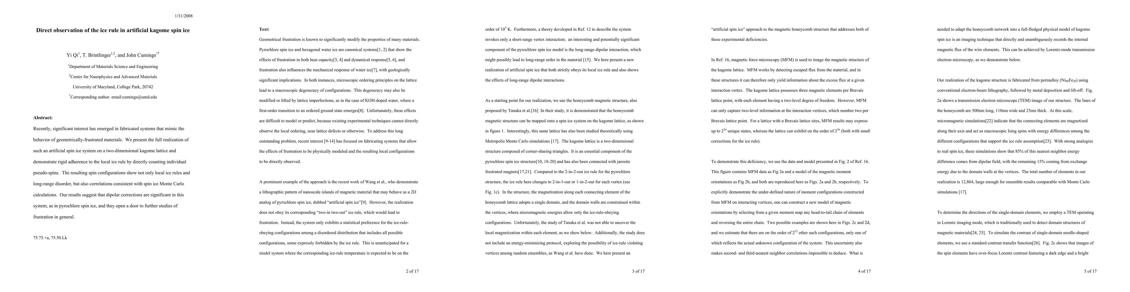 The paper reports the successful creation and direct observation of an artificial kagome spin ice system, showcasing strict adherence to the local ice rule through individual pseudo-spin counting. The observed spin configurations reveal long-range disorder and correlations aligning with Monte Carlo calculations, highlighting the importance of dipolar corrections similar to pyrochlore spin ice.