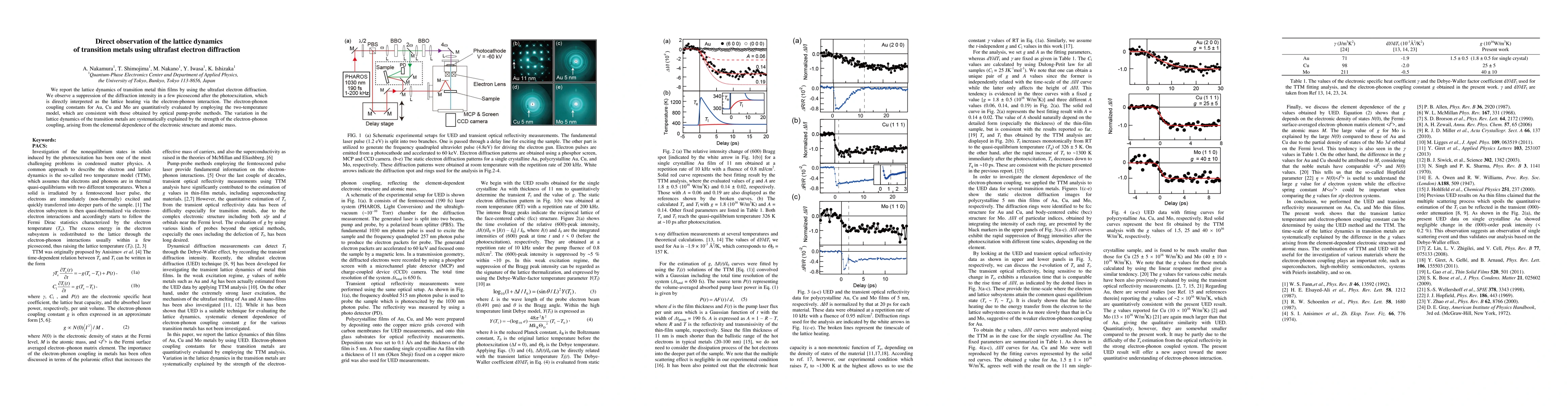 This study employs ultrafast electron diffraction to observe the lattice dynamics in transition metal thin films, revealing a rapid suppression of diffraction intensity post-photoexcitation indicative of lattice heating through electron-phonon interactions. The electron-phonon coupling constants for Au, Cu, and Mo are quantitatively evaluated, showing consistency with optical pump-probe methods and explaining variations in lattice dynamics based on electronic structure and atomic mass.