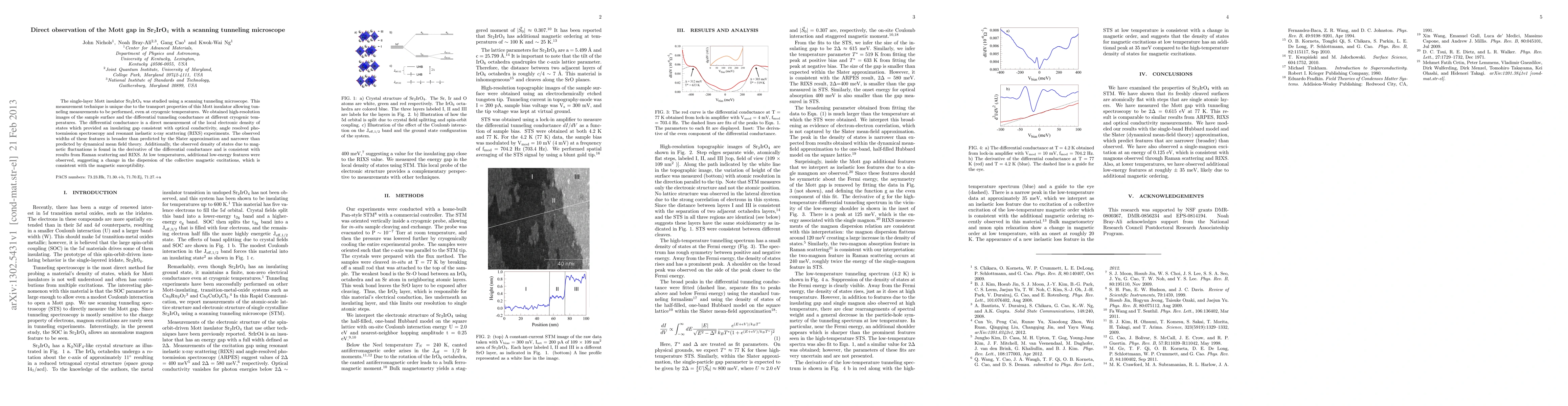 The single-layer Mott insulator strontium iridate Sr$_2$IrO$_4$ was studied using a scanning tunneling microscope. This measurement technique is unique due to the transport properties of this Mott insulator allowing tunneling measurements to be performed, even at cryogenic temperatures. We obtained high-resolution images of the sample surface and the differential tunneling conductance at different cryogenic temperatures. The differential conductance is a direct measurement of the local electronic density of states which provided an insulating gap consistent with optical conductivity, angle resolved photoemission spectroscopy and resonant inelastic x-ray scattering (RIXS) experiments. The observed widths of these features is broader than predicted by the Slater approximation and narrower than predicted by dynamical mean field theory. Additionally, the observed density of states due to magnetic fluctuations is found in the derivative of the differential conductance and is consistent with results from Raman scattering and RIXS. At low temperatures, additional low-energy features were observed, suggesting a change in the dispersion of the collective magnetic excitations, which is consistent with the magnetic susceptibility.