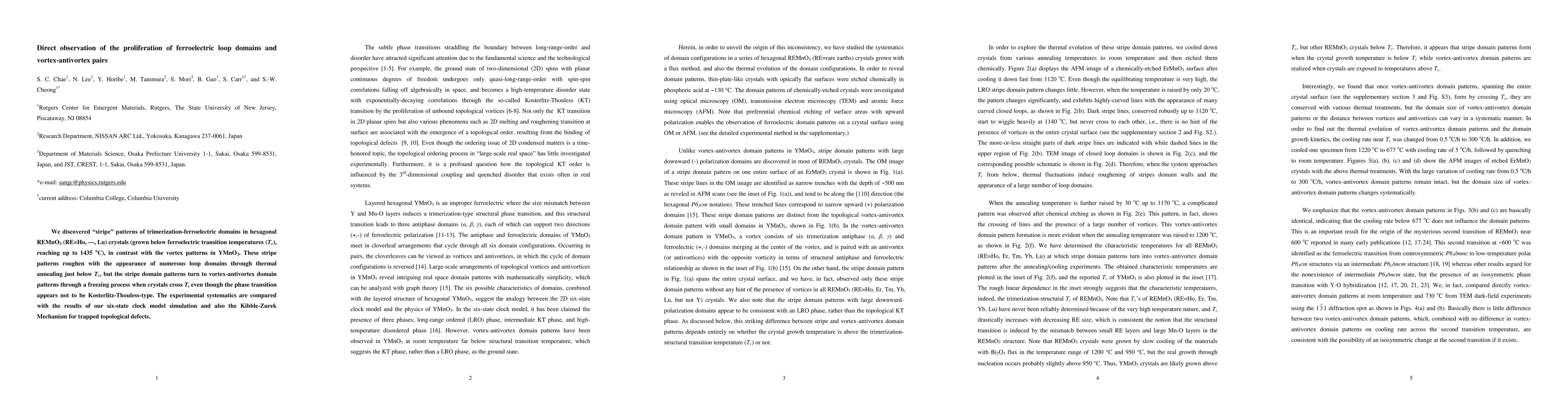 This study observes the transformation of ferroelectric domain patterns in hexagonal REMnO3 crystals, revealing stripe and loop domains below the transition temperature, and vortex-antivortex pairs above it, with simulations supporting the observed phenomena. The transition does not follow the Kosterlitz-Thouless mechanism.