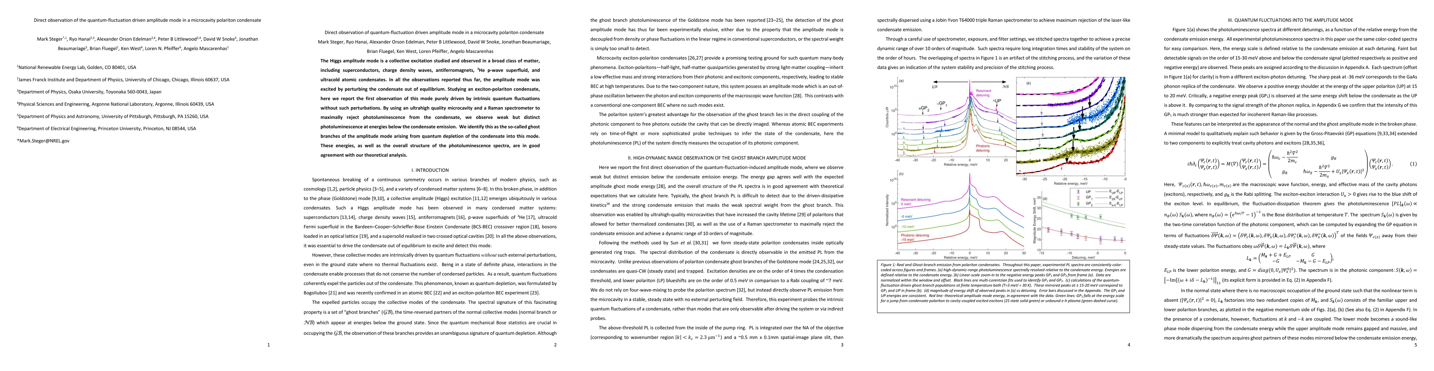 This paper reports the first direct observation of the quantum-fluctuation driven Higgs amplitude mode in a microcavity polariton condensate without external perturbations. Using advanced spectroscopic techniques, the researchers detected weak photoluminescence signals corresponding to the ghost branches of the amplitude mode, confirming theoretical predictions.