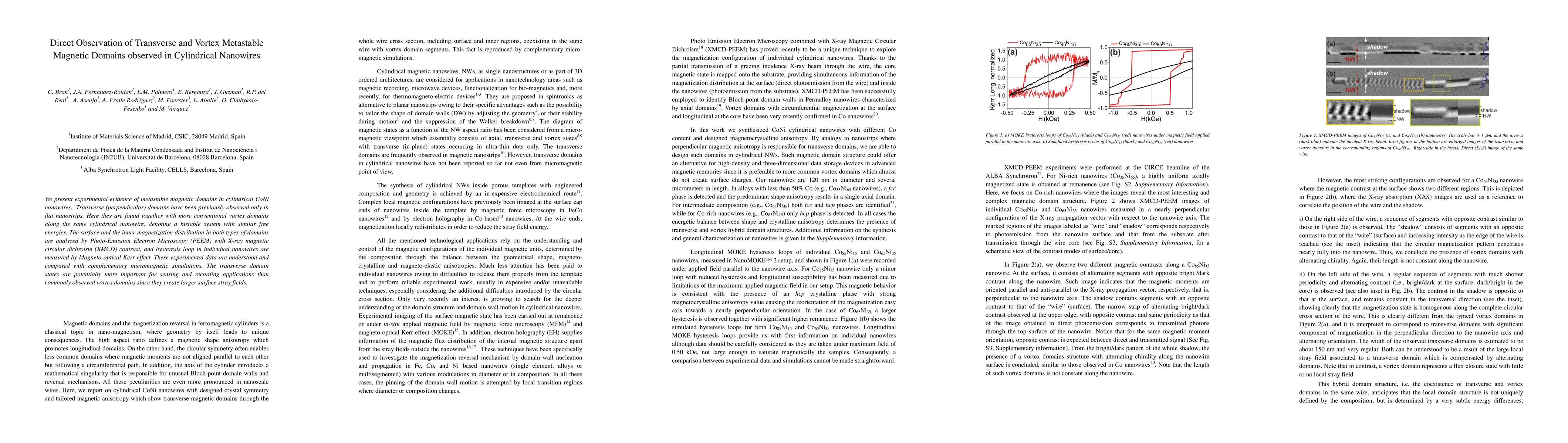 This paper reports the observation of metastable transverse and vortex magnetic domains in cylindrical CoNi nanowires using Photo-Emission Electron Microscopy and Magneto-optical Kerr effect, with simulations supporting the findings. The transverse domains, previously seen only in flat nanostrips, suggest a bistable system with significant potential for enhanced sensing and recording applications due to larger surface stray fields.