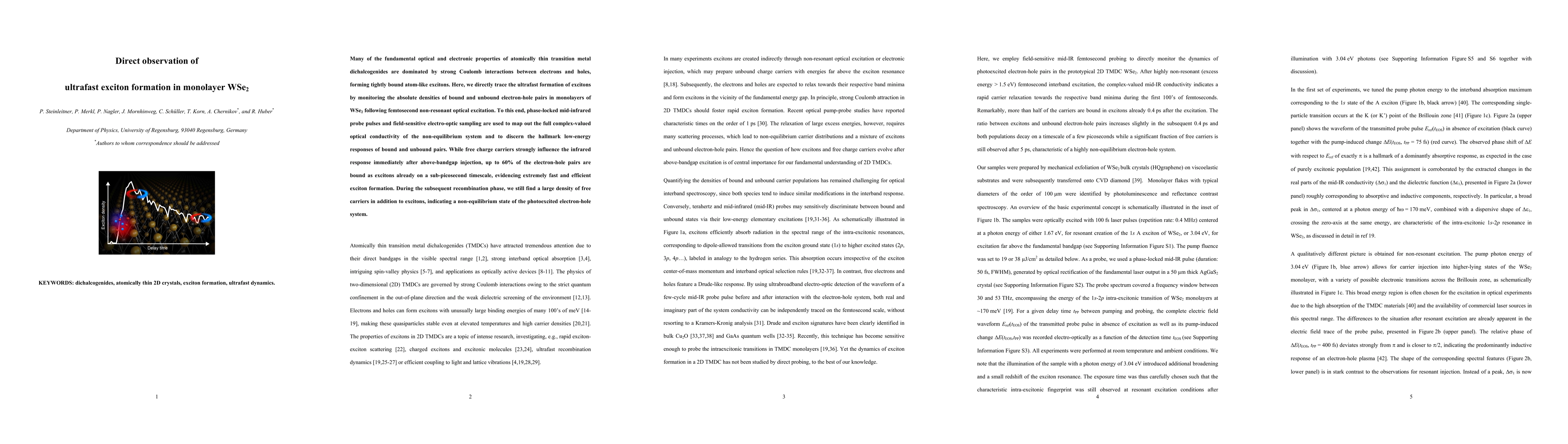 This research directly observes the rapid formation of excitons in monolayer WSe2 within a picosecond after optical excitation, using mid-infrared probe pulses and electro-optic sampling to map the optical conductivity. It reveals that up to 60% of electron-hole pairs form excitons swiftly, showcasing efficient exciton creation in these materials.
