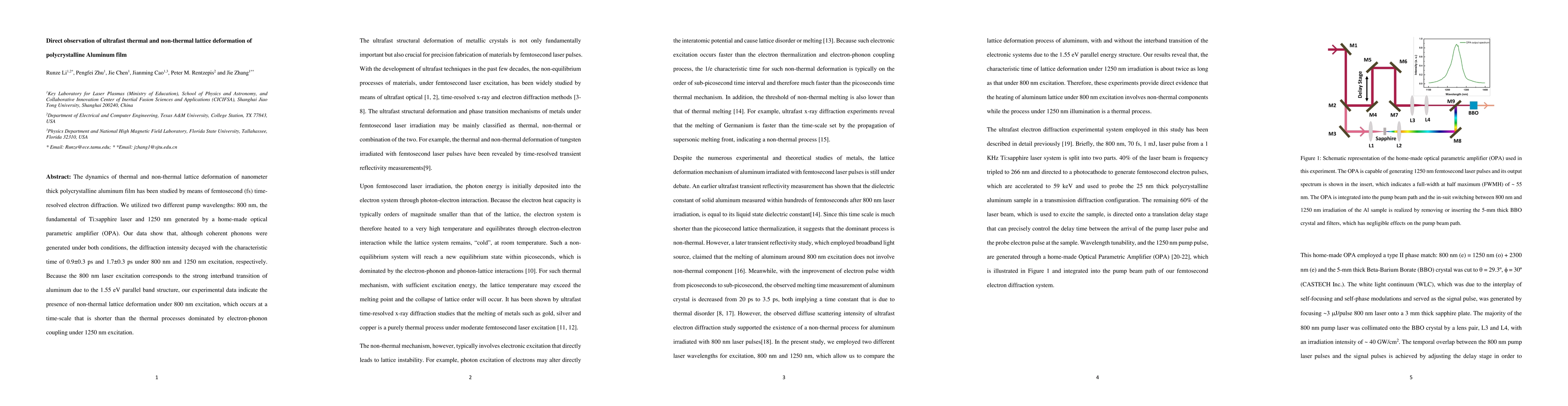 The dynamics of thermal and non-thermal lattice deformation of nanometer thick polycrystalline aluminum film has been studied by means of femtosecond (fs) time-resolved electron diffraction. We utilized two different pump wavelengths: 800 nm, the fundamental of Ti: sapphire laser and 1250 nm generated by a home-made optical parametric amplifier(OPA). Our data show that, although coherent phonons were generated under both conditions, the diffraction intensity decayed with the characteristic time of 0.9+/-0.3 ps and 1.7+/-0.3 ps under 800 nm and 1250 nm excitation, respectively. Because the 800 nm laser excitation corresponds to the strong interband transition of aluminum due to the 1.55 eV parallel band structure, our experimental data indicate the presence of non-thermal lattice deformation under 800 nm excitation, which occurs on a time-scale that is shorter than the thermal processes dominated by electron-phonon coupling under 1250 nm excitation.