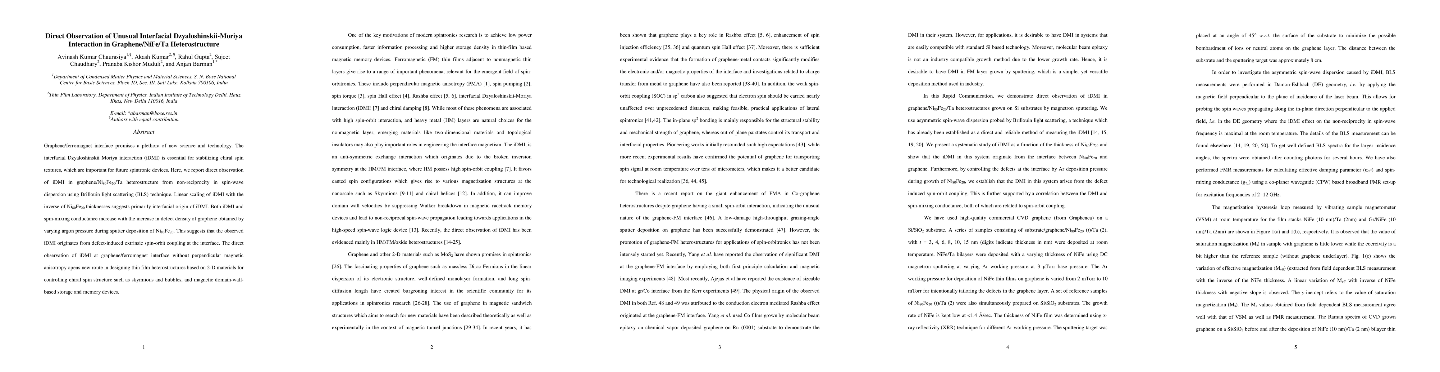 Researchers observed Dzyaloshinskii-Moriya interaction in graphene/NiFe/Ta heterostructure using Brillouin light scattering, suggesting defect-induced spin-orbit coupling at the interface controls its behavior.