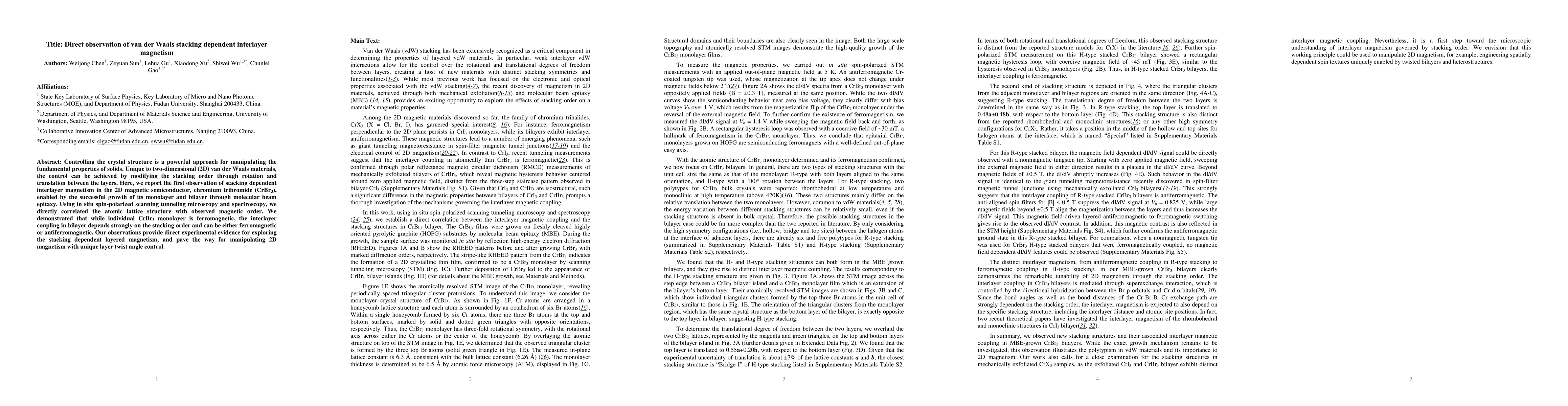 This paper reports the first observation of stacking-dependent interlayer magnetism in chromium tribromide (CrBr3) using monolayer and bilayer growth via molecular beam epitaxy. The study reveals that the interlayer coupling can be either ferromagnetic or antiferromagnetic depending on the stacking order, providing a pathway for manipulating 2D magnetism through precise layer twist angle control.