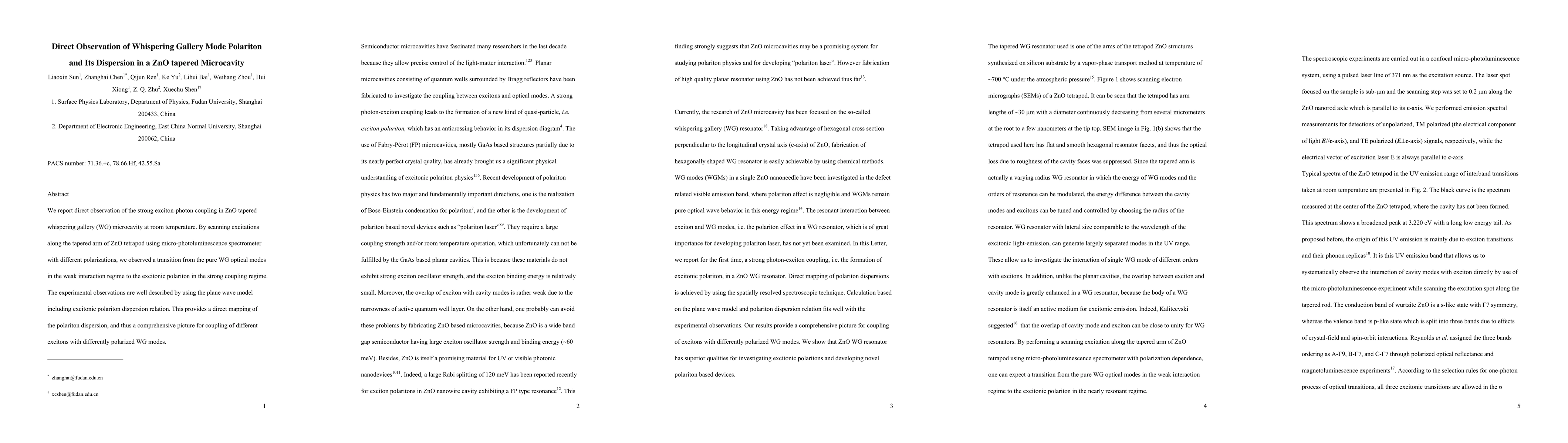 We report direct observation of the strong exciton-photon coupling in ZnO tapered whispering gallery (WG) microcavity at room temperature. By scanning excitations along the tapered arm of ZnO tetrapod using micro-photoluminescence spectrometer with different polarizations, we observed a transition from the pure WG optical modes in the weak interaction regime to the excitonic polariton in the strong coupling regime. The experimental observations are well described by using the plane wave model including excitonic polariton dispersion relation. This provides a direct mapping of the polariton dispersion, and thus a comprehensive picture for coupling of different excitons with differently polarized WG modes.