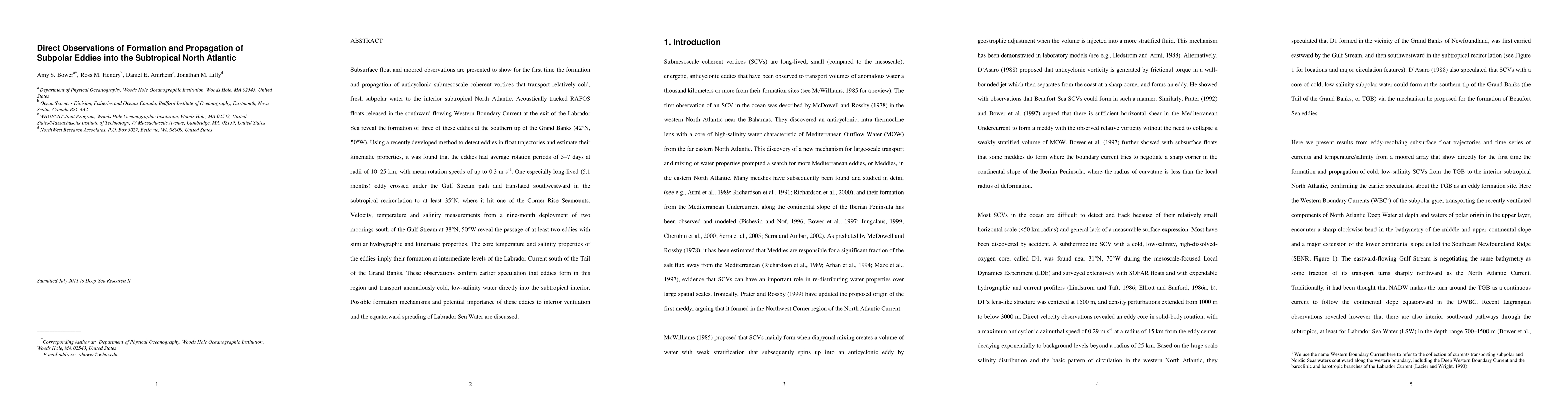 Subsurface float and moored observations are presented to show for the first time the formation and propagation of anticyclonic submesoscale coherent vortices that transport relatively cold, fresh subpolar water to the interior subtropical North Atlantic. Acoustically tracked RAFOS floats released in the southward-flowing Western Boundary Current at the exit of the Labrador Sea reveal the formation of three of these eddies at the southern tip of the Grand Banks (42 N, 50 W). Using a recently developed method to detect eddies in float trajectories and estimate their kinematic properties, it was found that the eddies had average rotation periods of 5--7 days at radii of 1025 km, with mean rotation speeds of up to 0.3 m/s. One especially long-lived (5.1 months) eddy crossed under the Gulf Stream path and translated southwestward in the subtropical recirculation to at least 35 N, where it hit one of the Corner Rise Seamounts. Velocity, temperature and salinity measurements from a nine-month deployment of two moorings south of the Gulf Stream at 38 N, 50 W reveal the passage of at least two eddies with similar hydrographic and kinematic properties. The core temperature and salinity properties of the eddies imply their formation at intermediate levels of the Labrador Current south of the Tail of the Grand Banks. These observations confirm earlier speculation that eddies form in this region and transport anomalously cold, low-salinity water directly into the subtropical interior. Possible formation mechanisms and potential importance of these eddies to interior ventilation and the equatorward spreading of Labrador Sea Water are discussed.