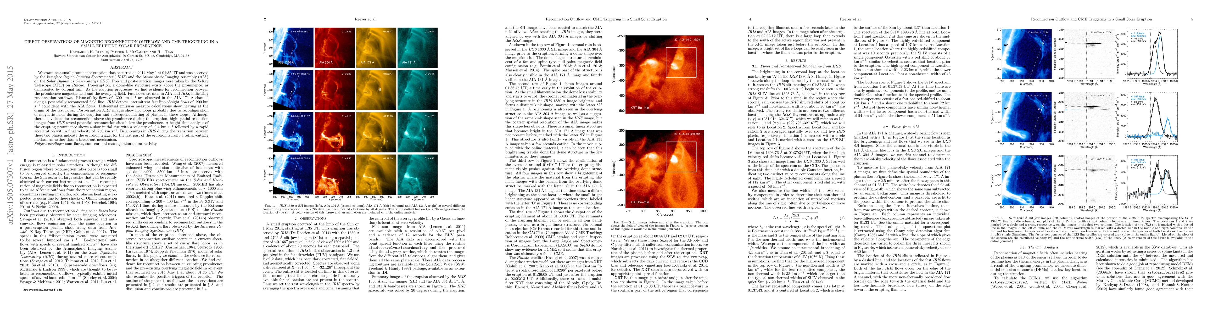 This study observes a small solar prominence eruption on May 1, 2014, using IRIS, AIA, and XRT, revealing reconnection outflows and triggering mechanisms. Evidence suggests reconnection both above and below the prominence, with fast flows and heating indicating magnetic reconnection.