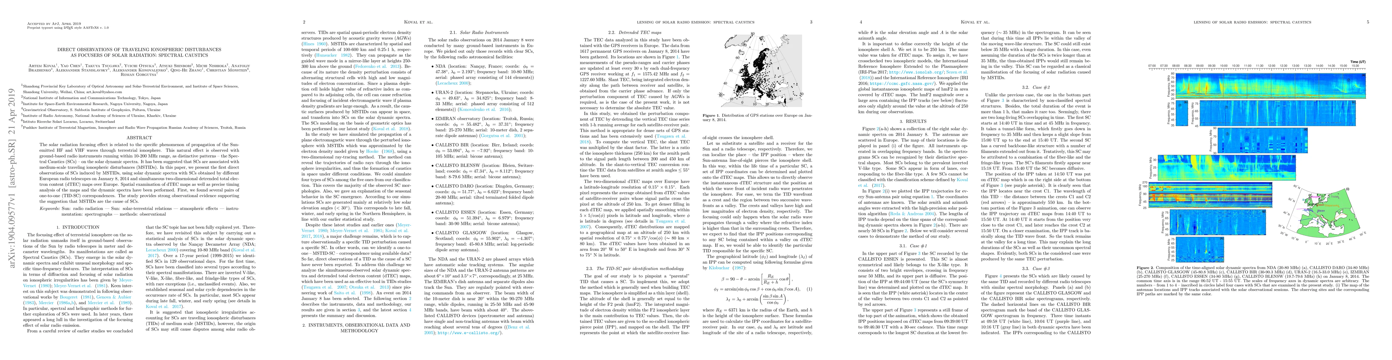 The solar radiation focusing effect is related to the specific phenomenon of propagation of the Sun-emitted HF and VHF waves through terrestrial ionosphere. This natural effect is observed with ground-based radio instruments running within 10-200 MHz range, as distinctive patterns - the Spectral Caustics (SCs) - on the solar dynamic spectra. It has been suggested that SCs are associated with medium-scale traveling ionospheric disturbances (MSTIDs). In this paper, we present the first direct observations of SCs induced by MSTIDs, using solar dynamic spectra with SCs obtained by different European radio telescopes on January 8, 2014 and simultaneous two-dimensional detrended total electron content (dTEC) maps over Europe. Spatial examination of dTEC maps as well as precise timing analysis of the maps and the dynamic spectra have been performed. First, we found several pairs of one-to-one (TID-SC) correspondences. The study provides strong observational evidence supporting the suggestion that MSTIDs are the cause of SCs.