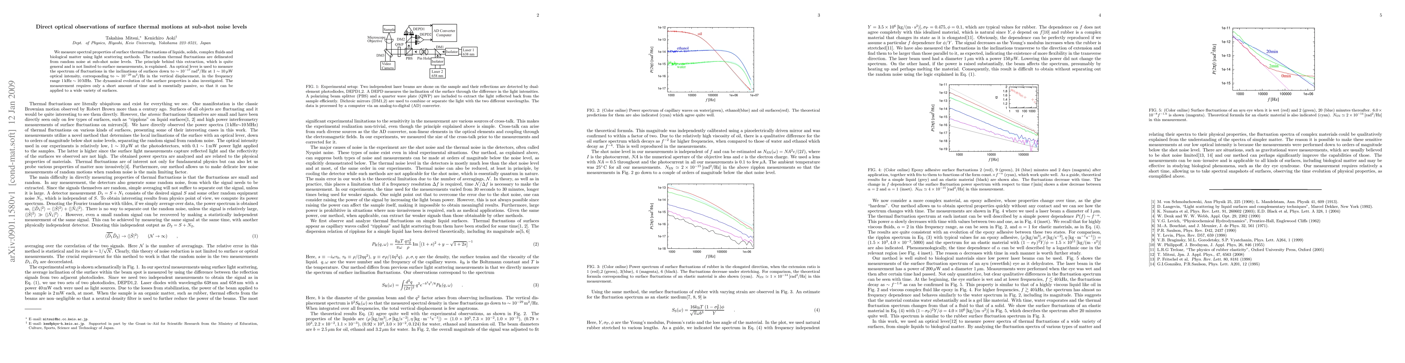 We measure spectral properties of surface thermal fluctuations of liquids, solids, complex fluids and biological matter using light scattering methods. The random thermal fluctuations are delineated from random noise at sub-shot noise levels. The principle behind this extraction, which is quite general and is not limited to surface measurements, is explained. An optical lever is used to measure the spectrum of fluctuations in the inclinations of surfaces down to $\sim 10^{-17}\rm rad^2/Hz$ at $1\sim10 \mu$W optical intensity, corresponding to $\sim 10^{-29} \rm m^2/\rm Hz$ in the vertical displacement, in the frequency range $1{\rm}\rm kHz\sim10 MHz$. The dynamical evolution of the surface properties is also investigated. The measurement requires only a short amount of time and is essentially passive, so that it can be applied to a wide variety of surfaces.