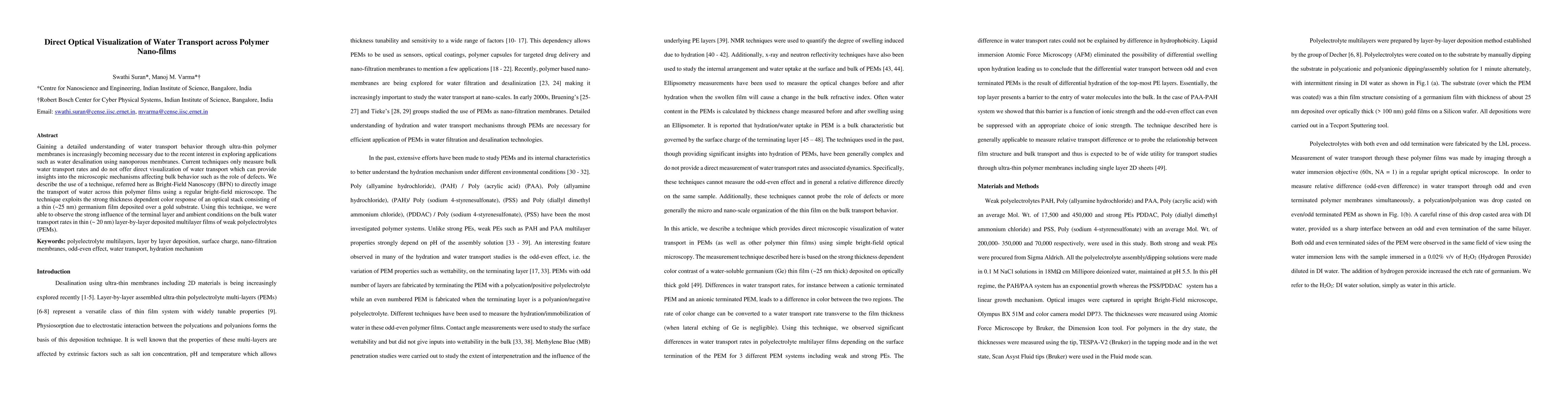 This paper uses Bright-Field Nanoscopy (BFN) to directly visualize water transport across ultra-thin polymer nanofilms, revealing the influence of the terminal layer and ambient conditions on bulk transport rates, which is crucial for applications like water desalination.