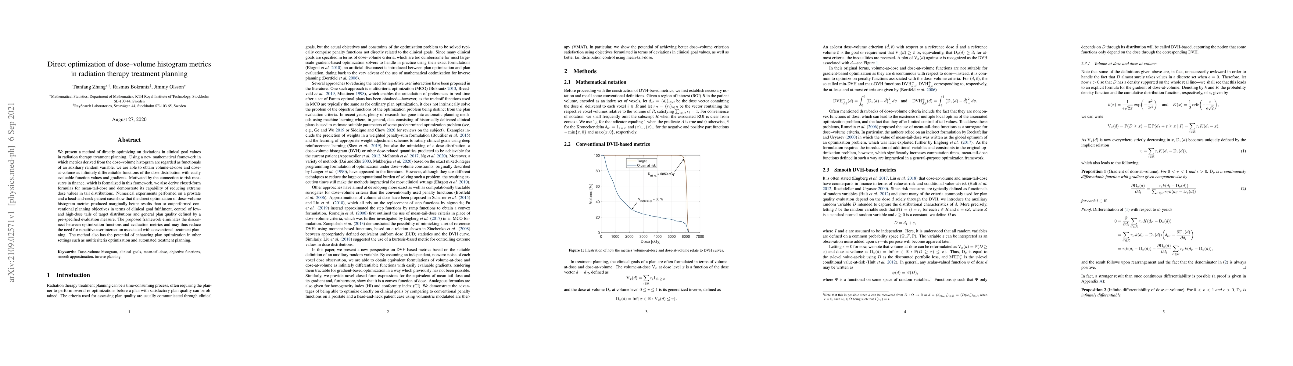 This paper introduces a novel method for optimizing dose-volume histogram metrics in radiation therapy planning, directly addressing deviations in clinical goals. The new mathematical framework enables the optimization of dose distributions to better control low- and high-dose tails, resulting in improved plan quality compared to conventional methods.
